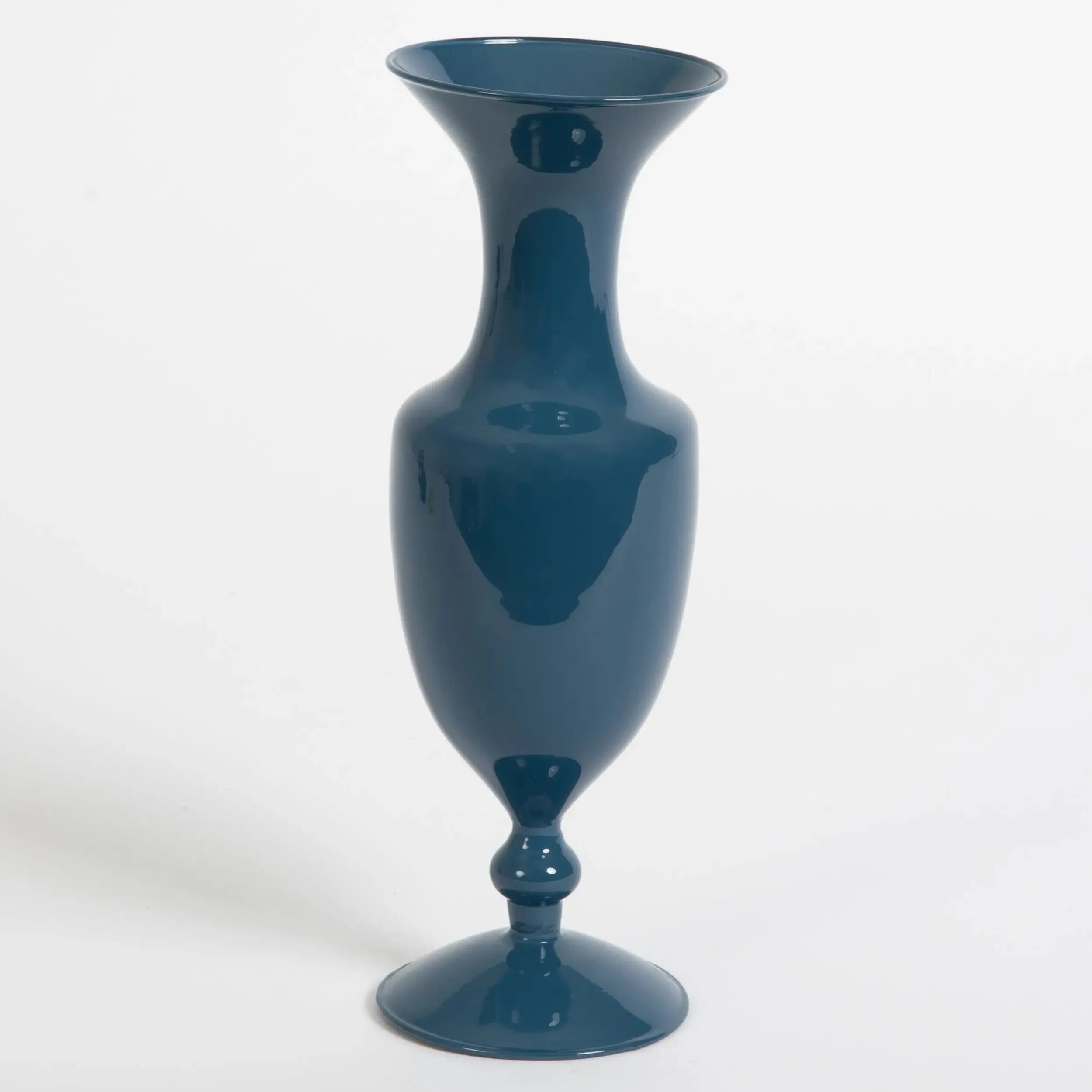 Glossy, opaque milk glass has been masterfully manipulated into a modern interpretation of a Greco-Roman urn shaped Glass Vase, finished in a royal shade of navy blue ready for the additions of flowers.