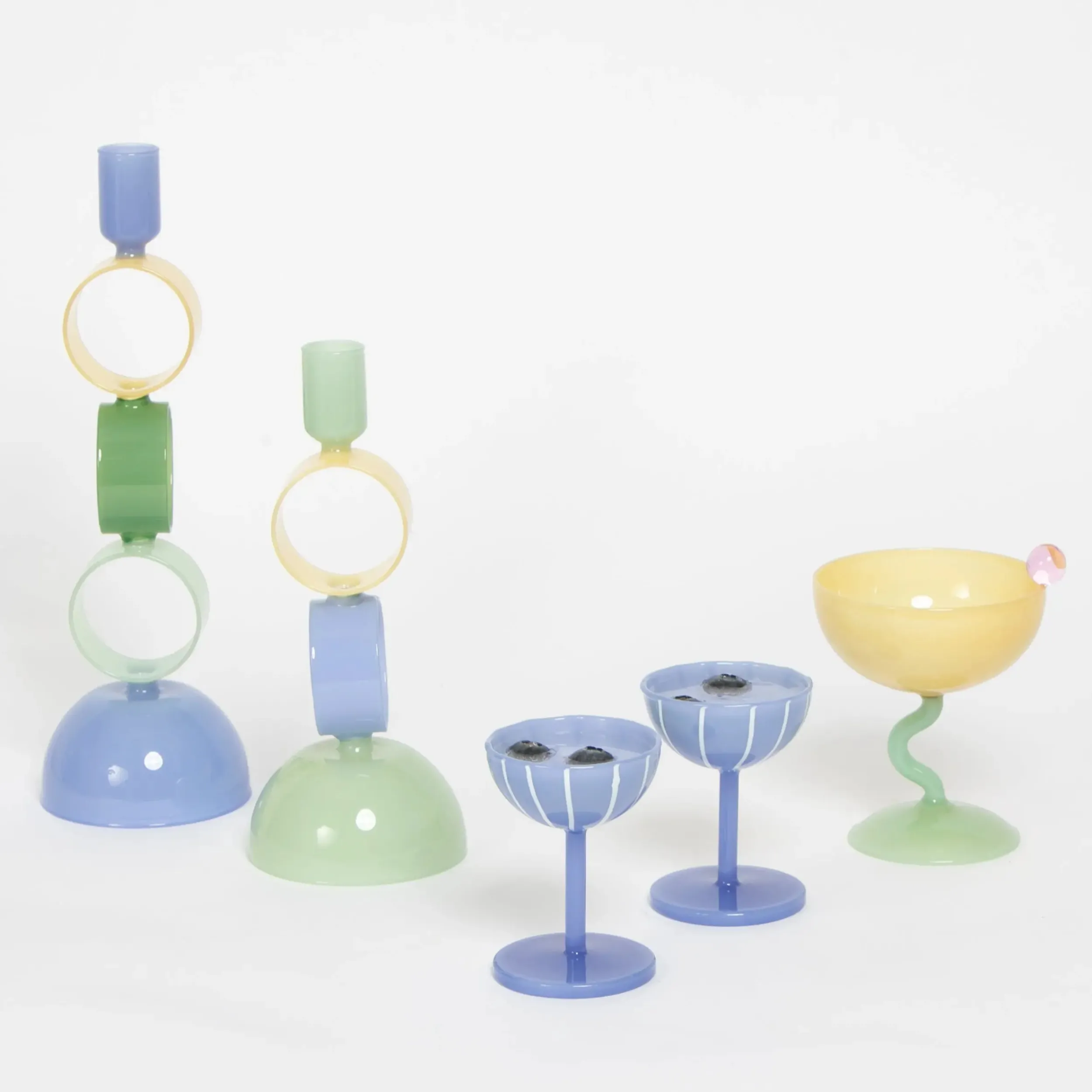 This cute take on a Shot Glass features four half-moon shaped glasses in a milky mid-blue with fine white line detail; the stemmed design adds a chic touch to your next shot (alcoholic or turmeric!)