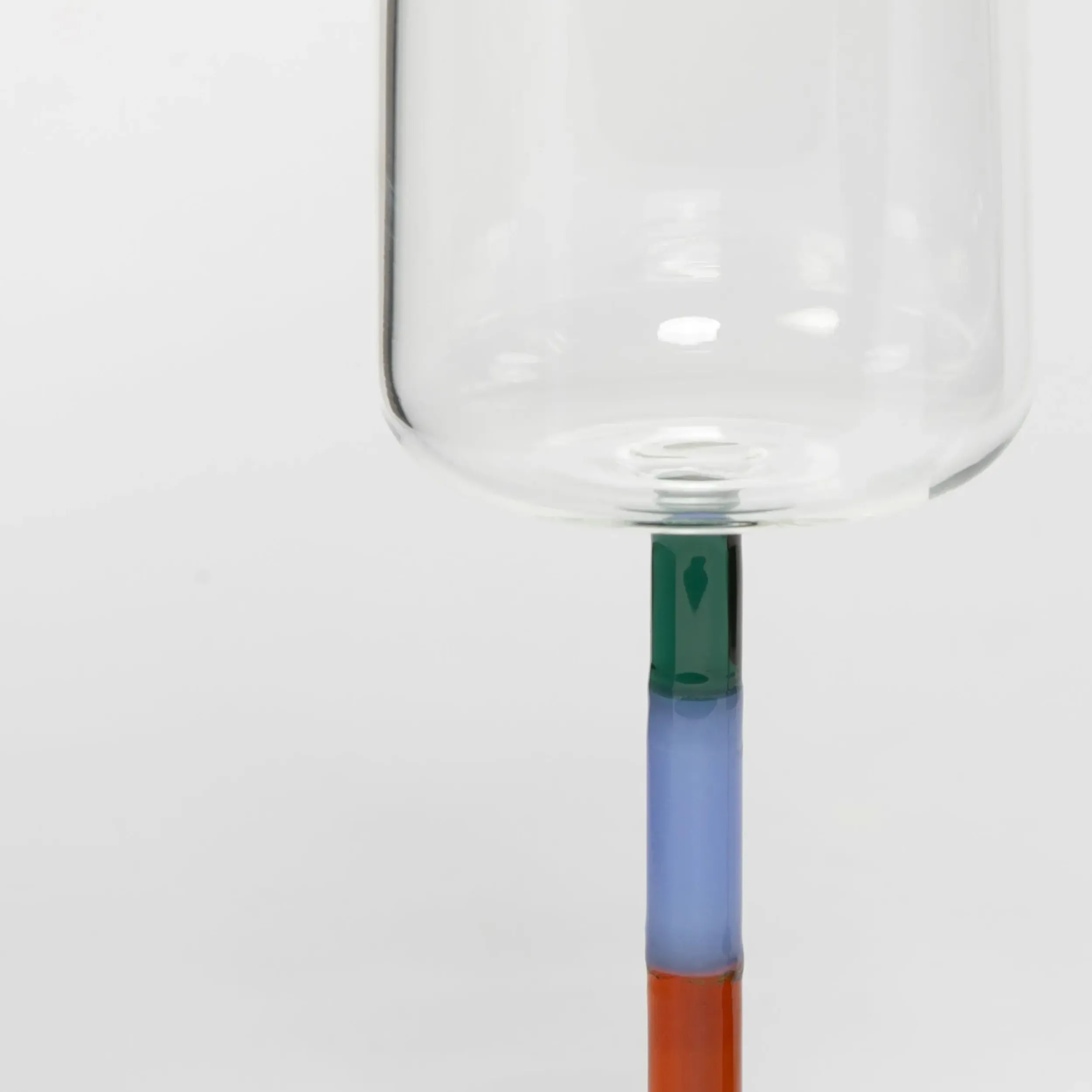 Sip, toast and cheers in style with this masterly crafted Wine Glass set with tinted glass stem in mid-tones of teal, blue and amber set against a clear glass, straight-sided bowl.