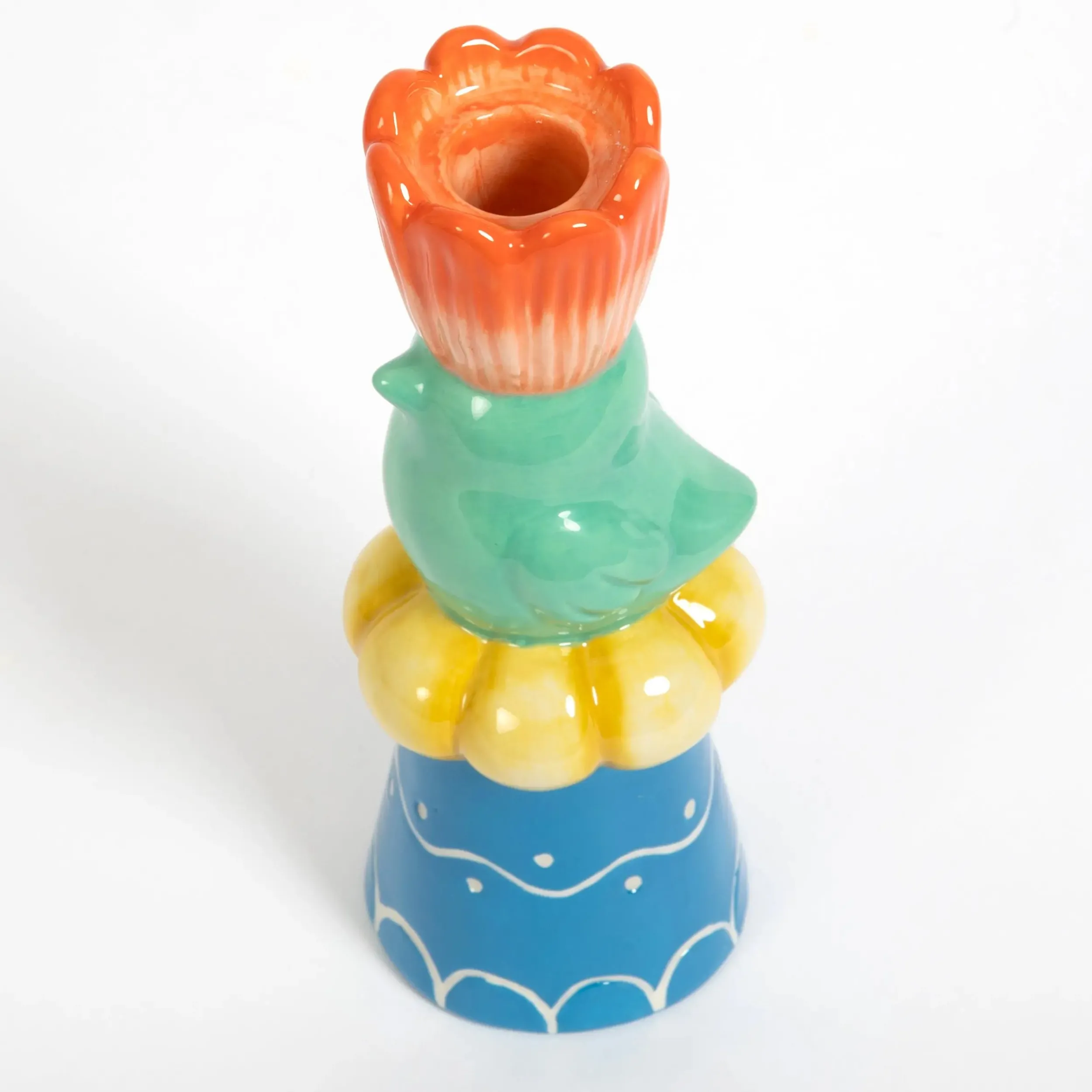 Charming coloured ceramic combines with sweet country motifs in this hen and flower-shaped unique taper candle holder in glazed shades of aqua, apricot, pale yellow and blue ceramic.