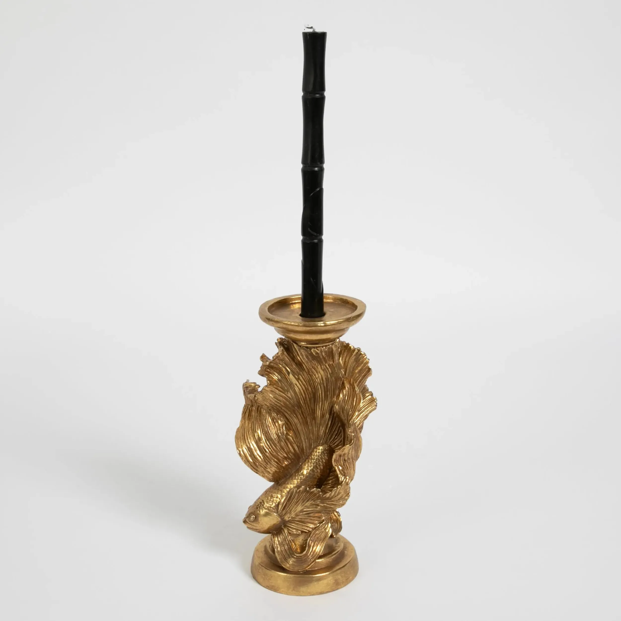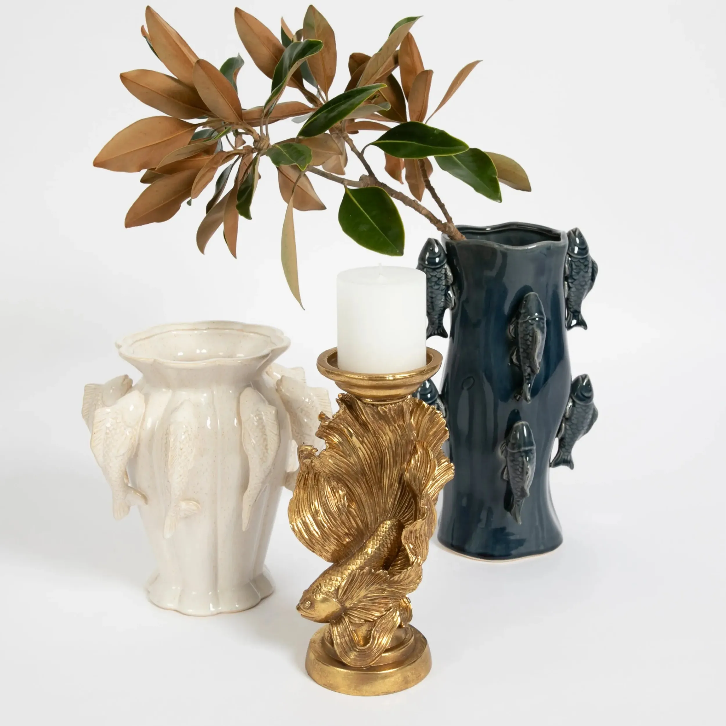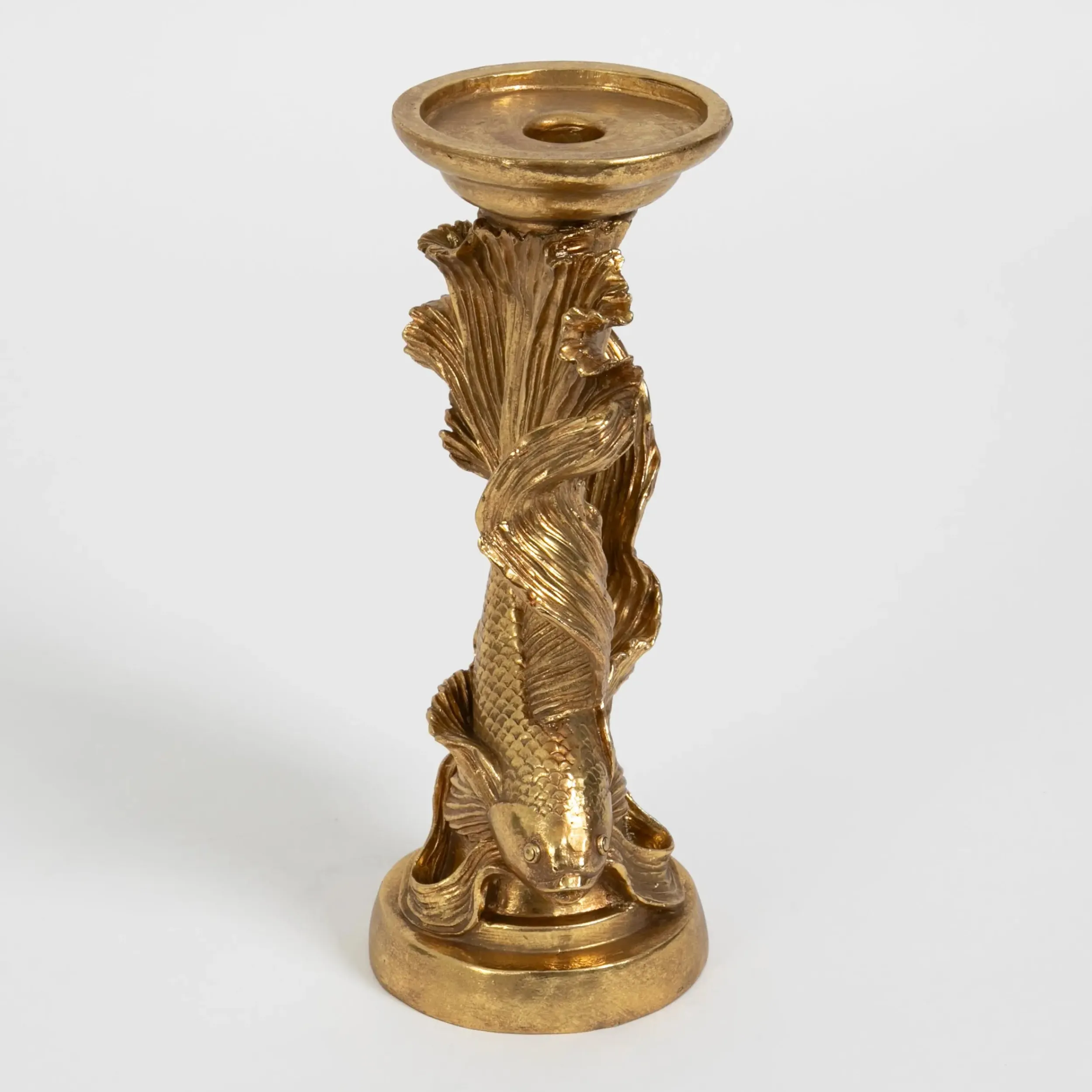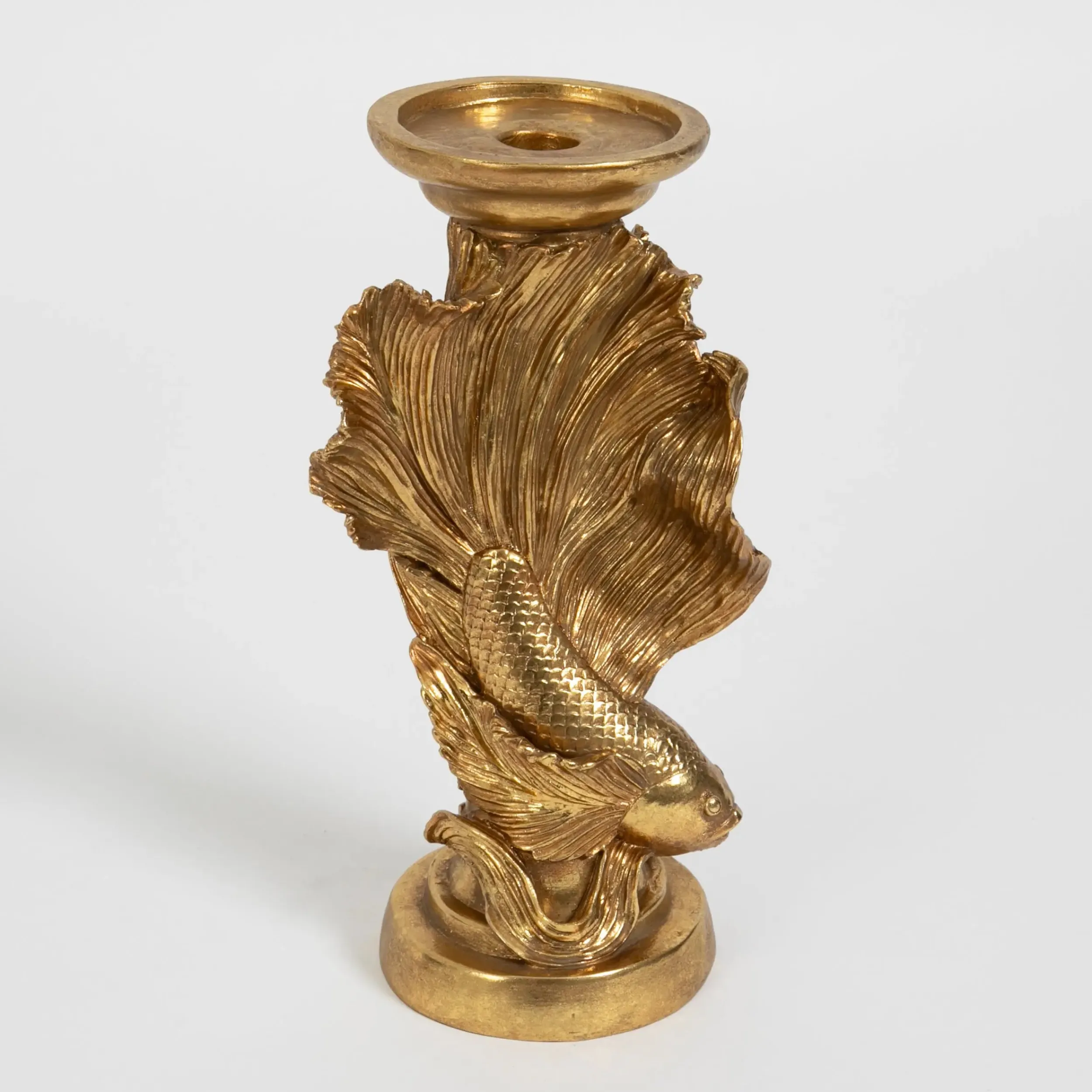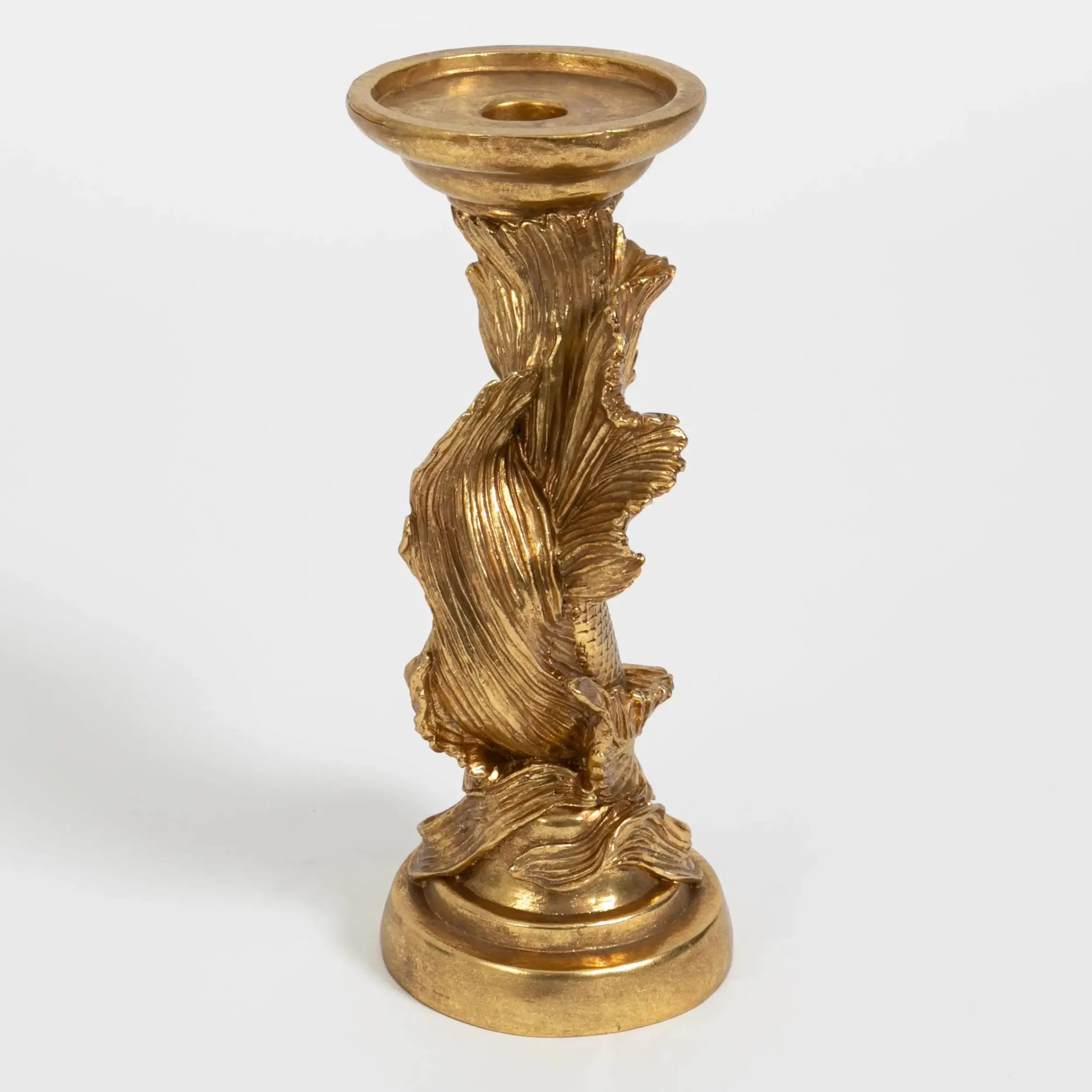 Create your own underwater inspired Atlantis with this striking gold resin pillar Candle Holder featuring swimming koi fish. Lightweight yet durable, this metallic decor item elevates desks, bedsides, bookshelves and dining settings.