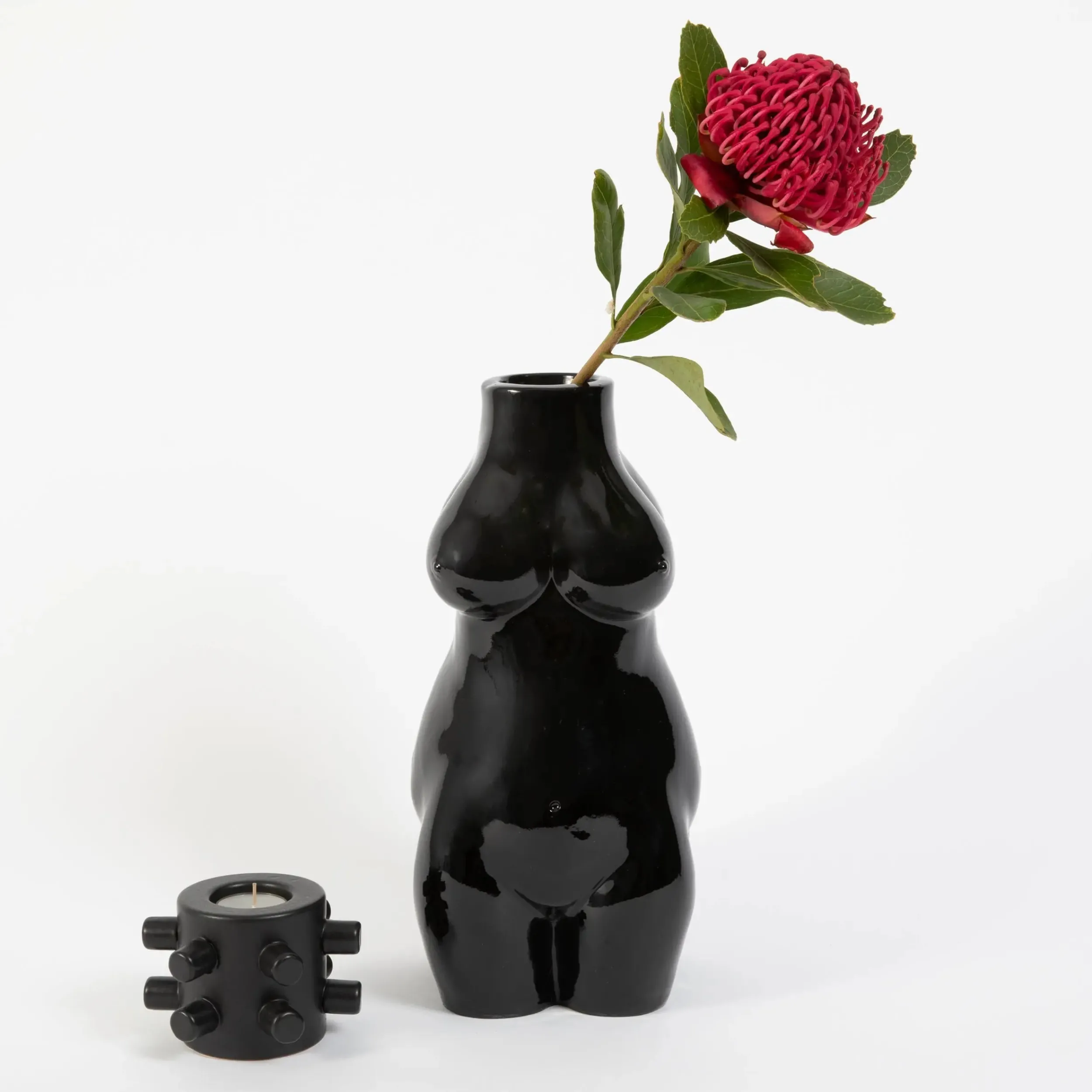 Part sculpture, part Resin Vase, this black resin decorative item celebrates the majesty of the female form from all sides. Add a sensual aesthetic to bedsides, bathroom vanities or living rooms with this anatomically arousing vase.
