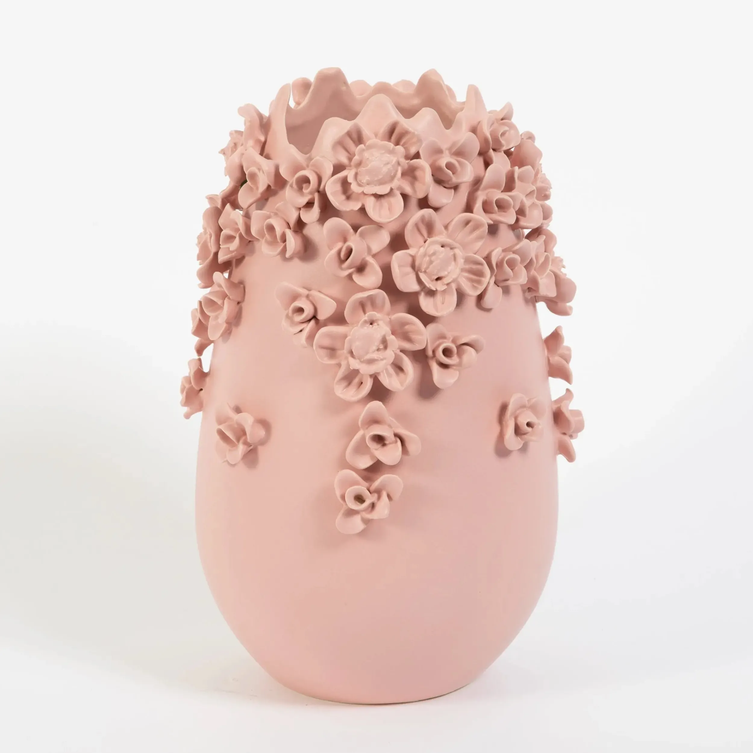 Strands of cascading ceramic flowers adorn this tall, glazed Ceramic Vase in feminine blush pink. A striking piece to create your own manicured garden aesthetic.