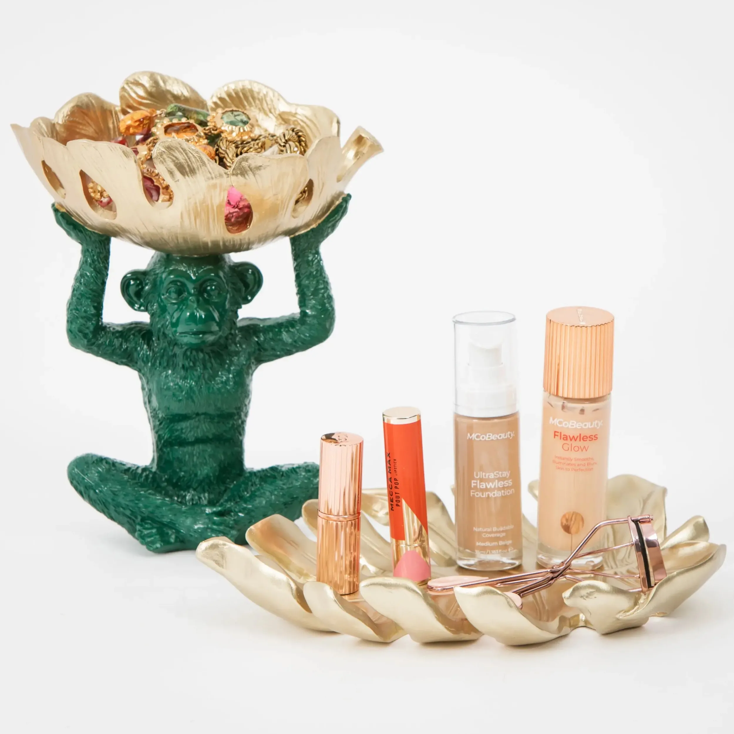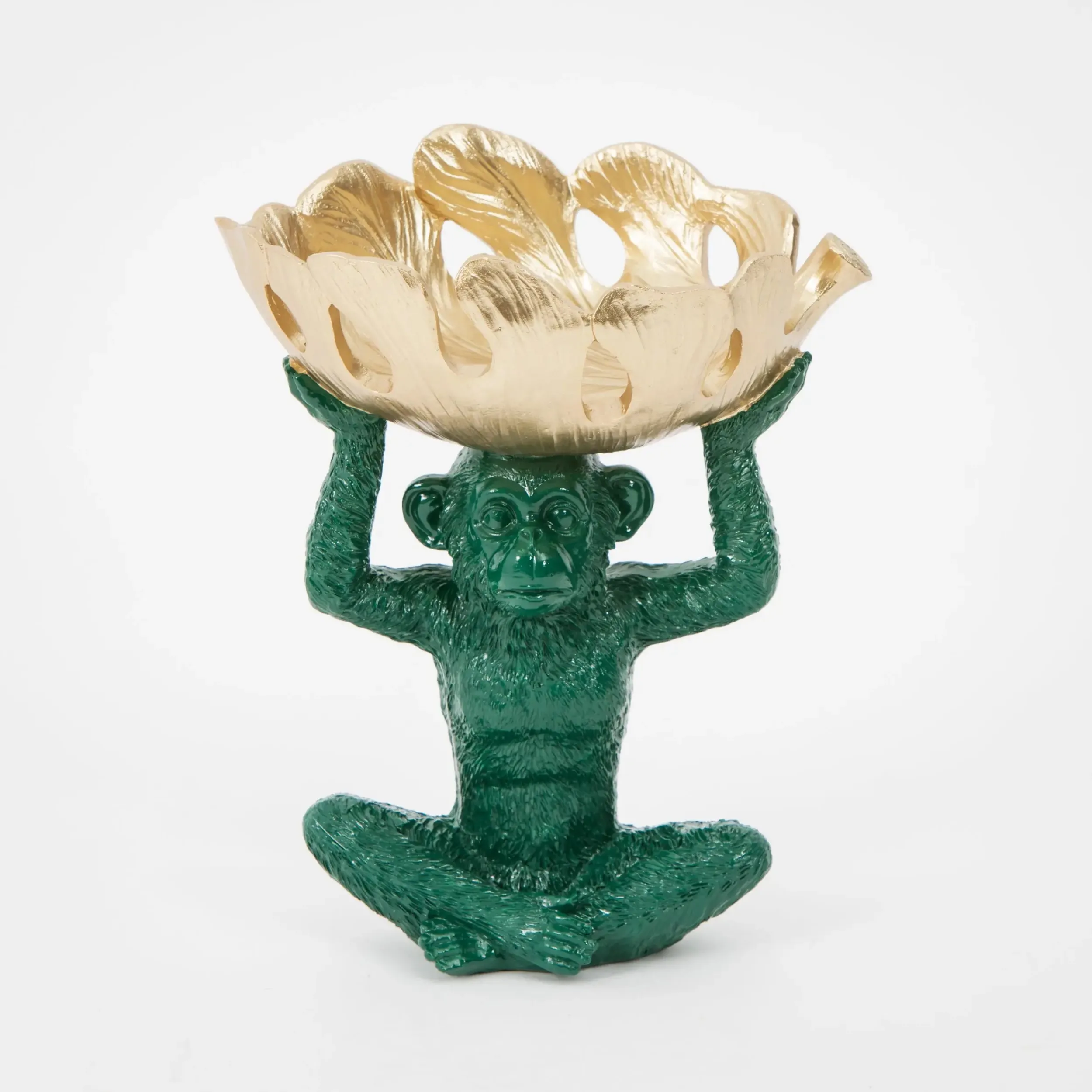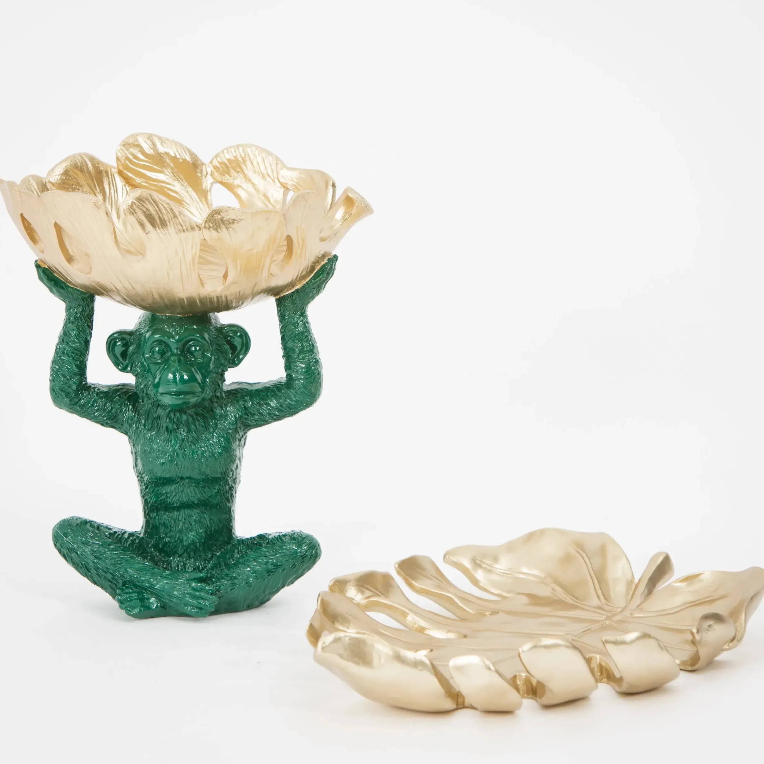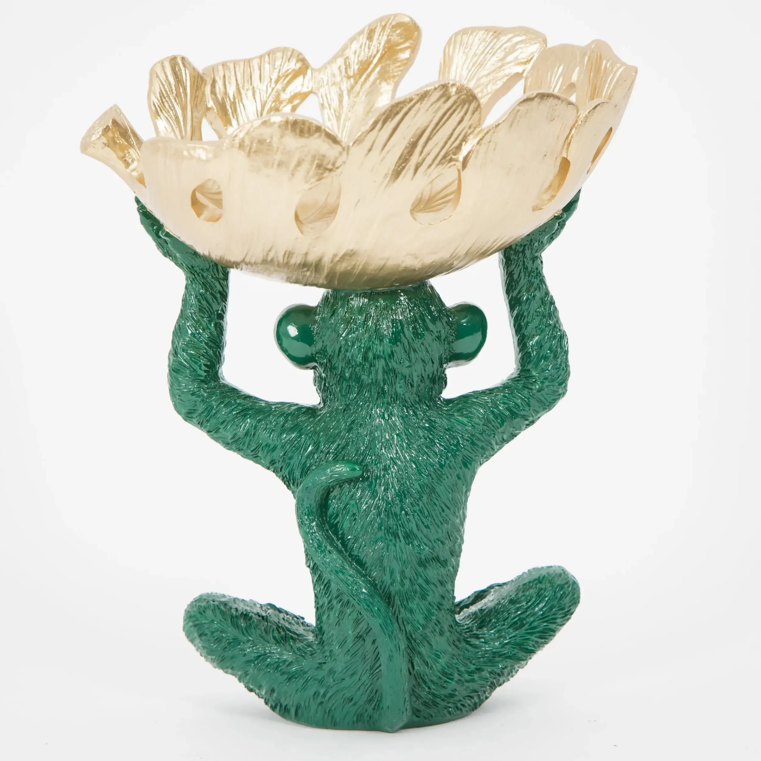 Add Zen-like balance to your space with this resting monkey Resin Sculpture in striking bottle green resin supporting a gold painted palm leaf that provides form and function as a sculpture or decorative tray.