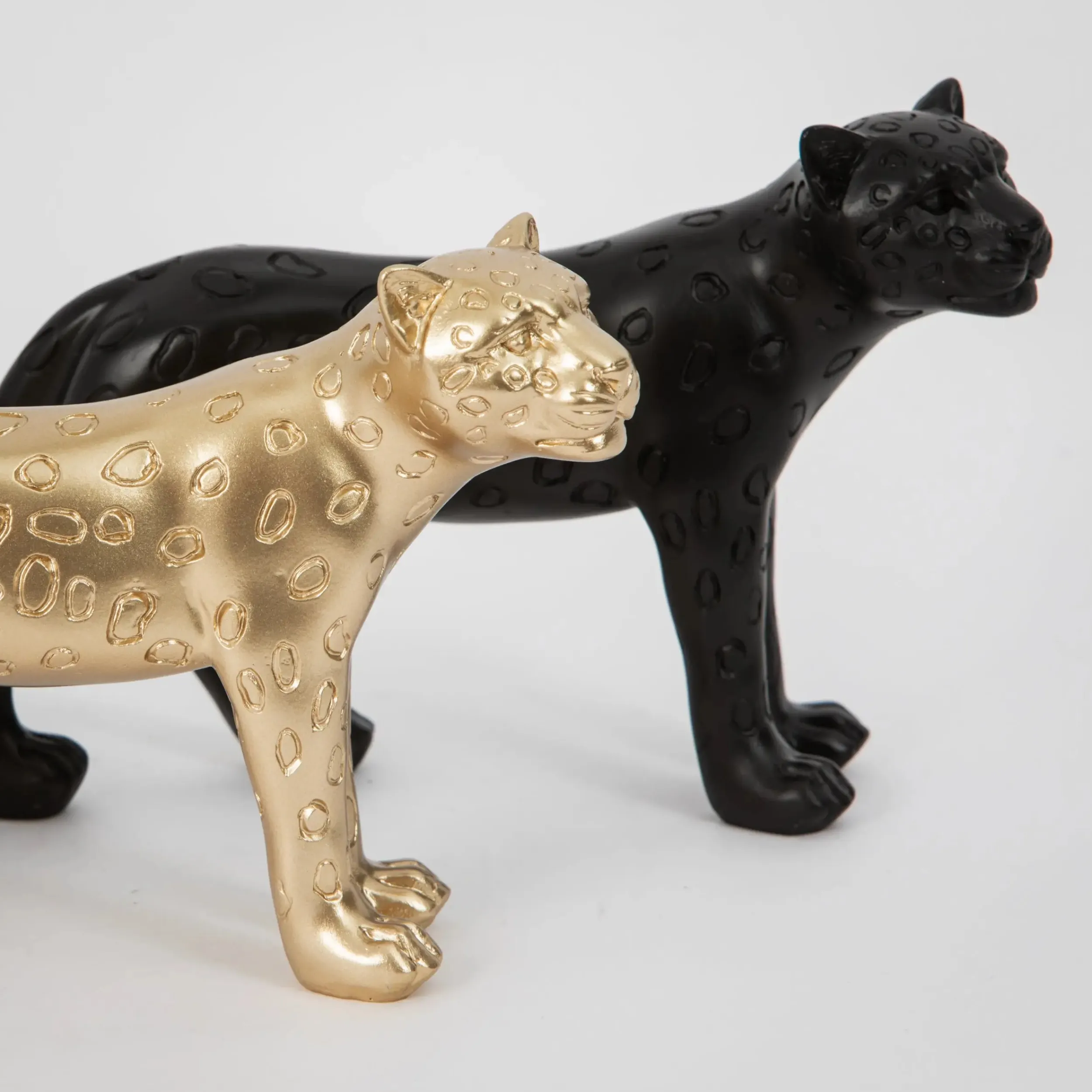 Walk on the wild side of homewares with a jungle cat shaped Sculpture. Style this luxe set of two jungle cat shaped sculptural objects in striking black and gilded gold resin together or separately to add drama to home or office.