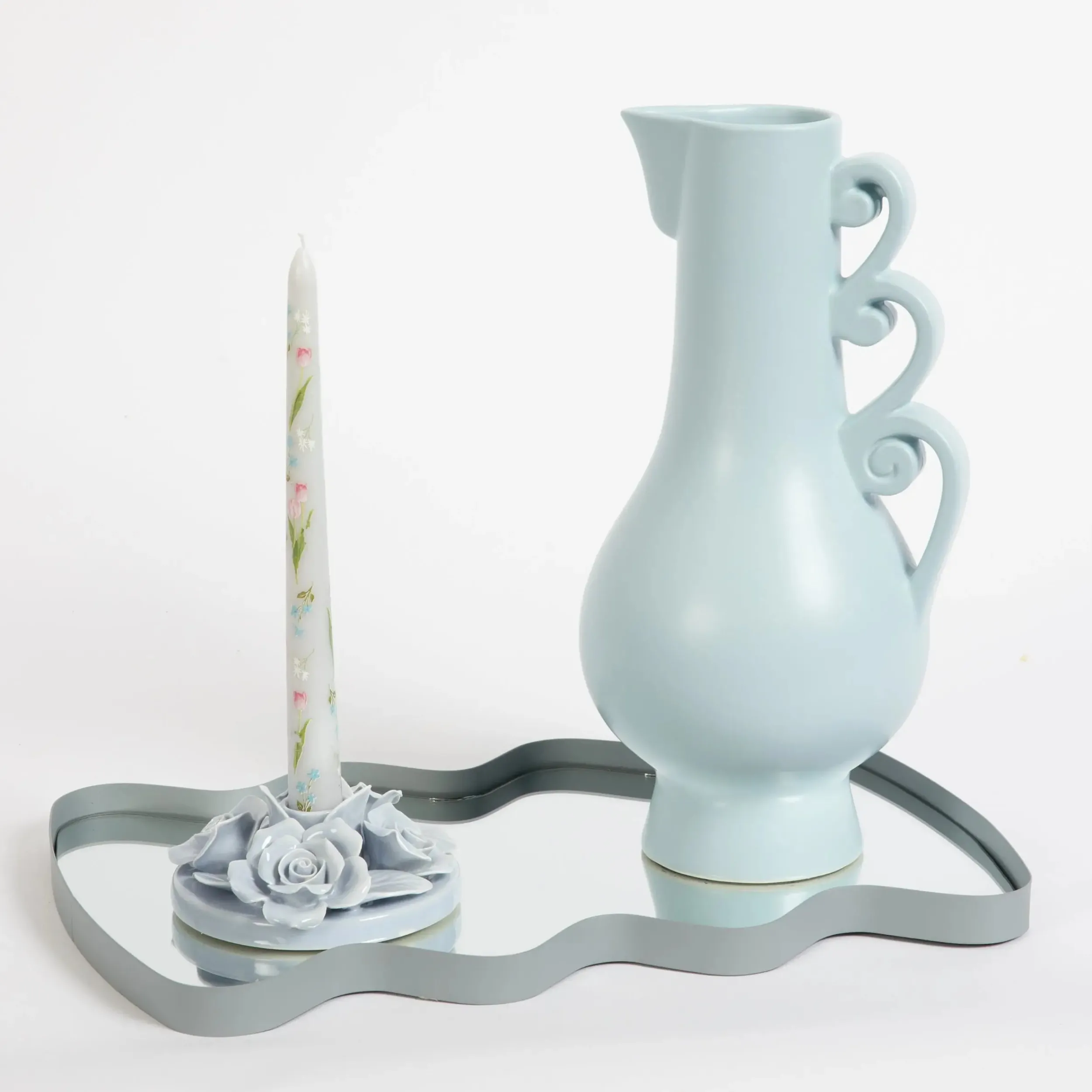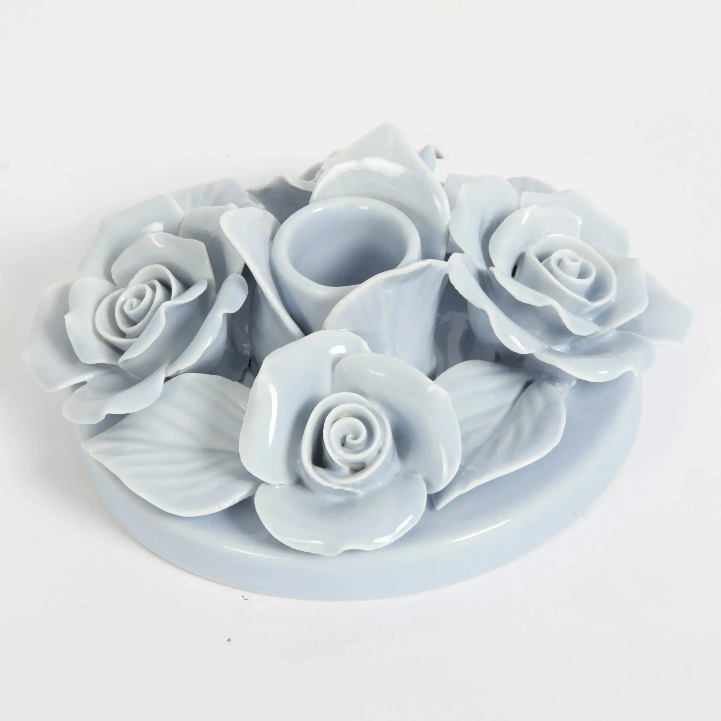 Inspired by vintage ceramicware, this masterfully crafted taper Ceramic Candle Holder is the epitome of period era femininity featuring a delicately carved crown of roses and petals in soft blue.