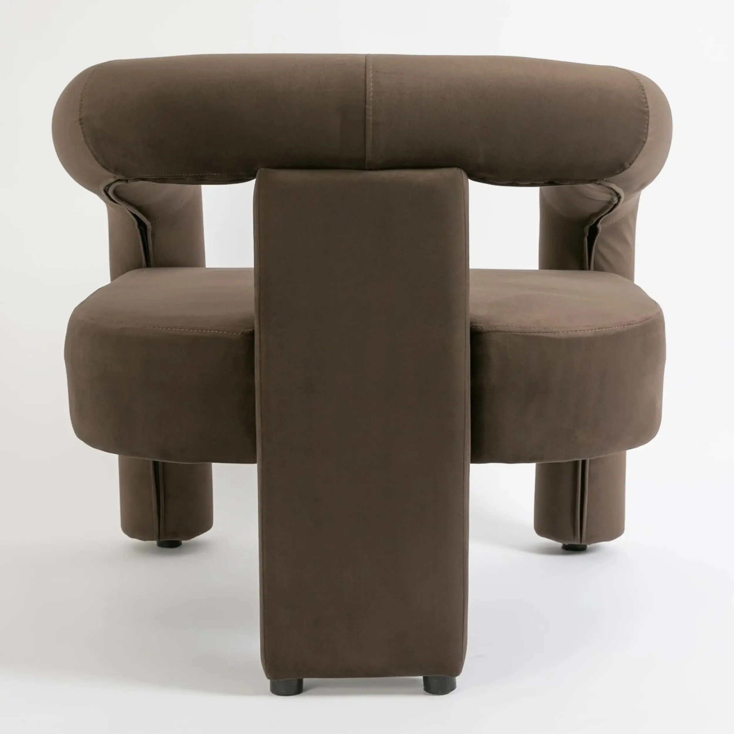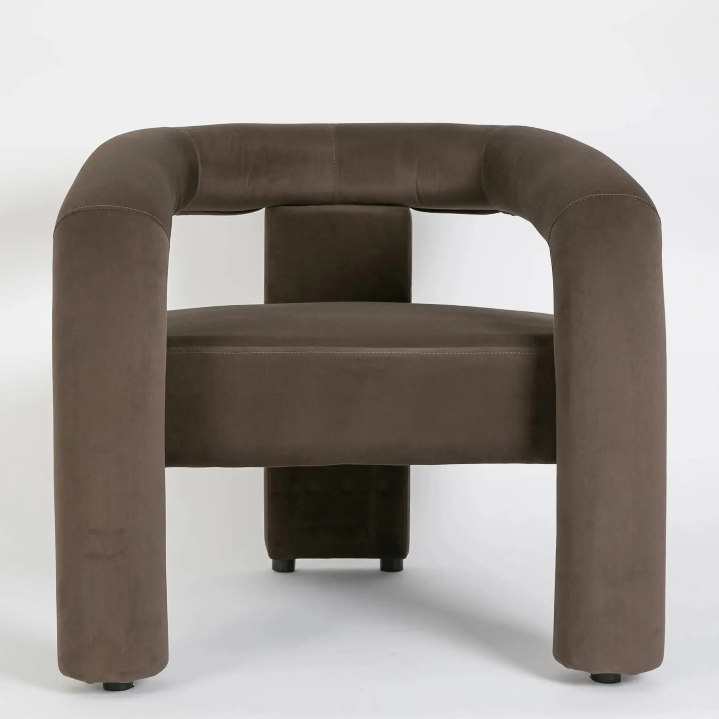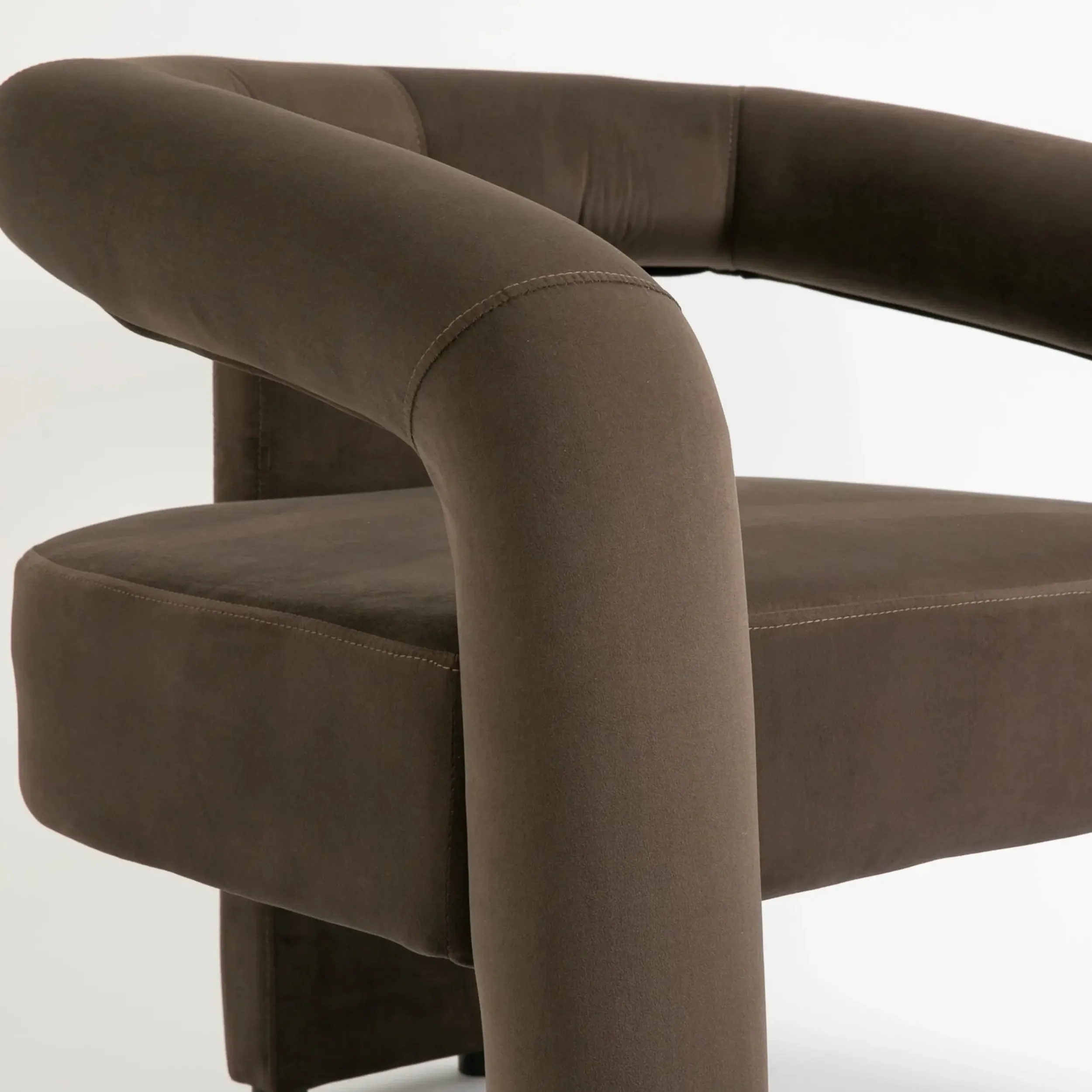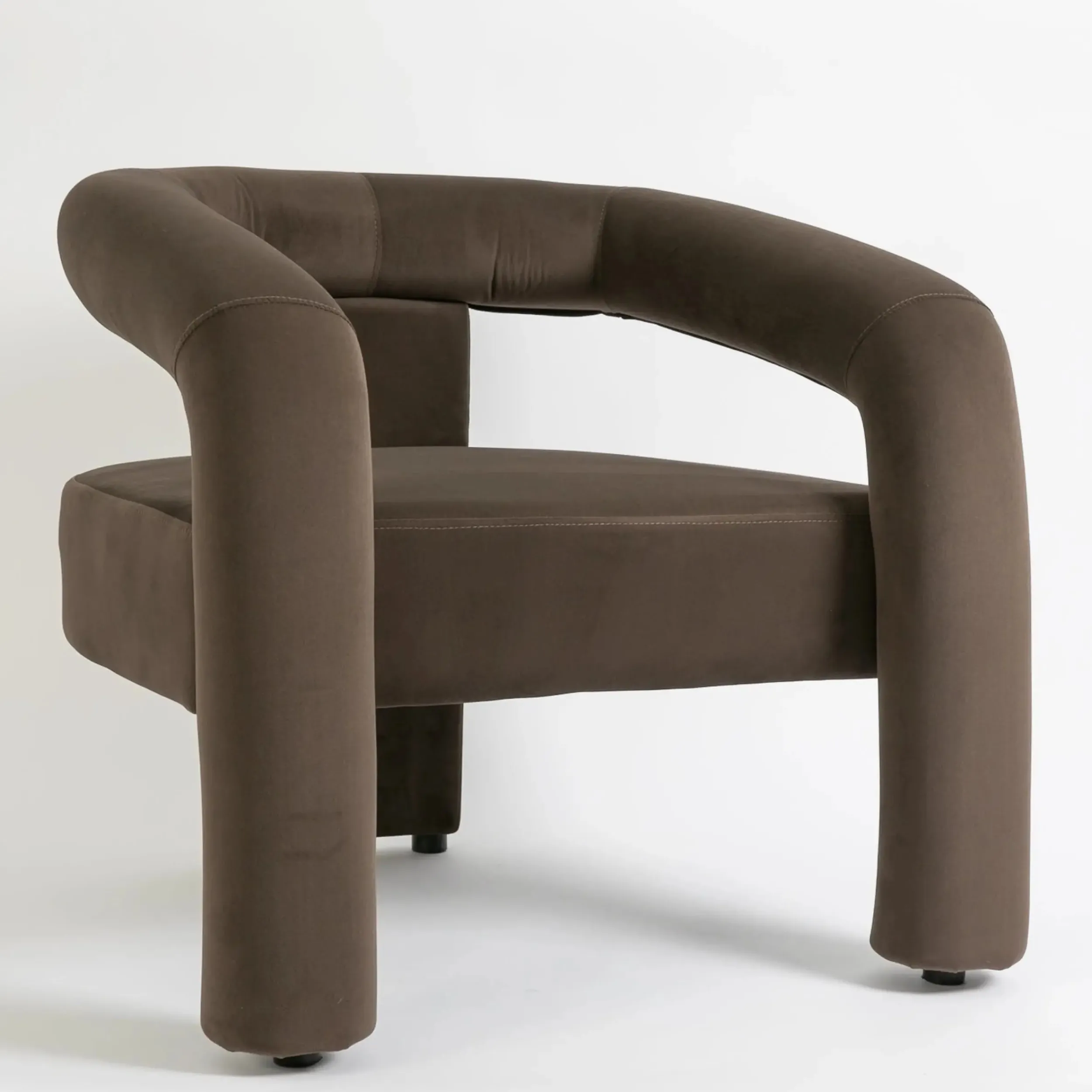 Enhance your sitting areas with this soft to the touch, chocolate brown Velvet Armchair with contemporary tri-leg design and curved, supportive armrests. A modern shape to add extra seating to your space.