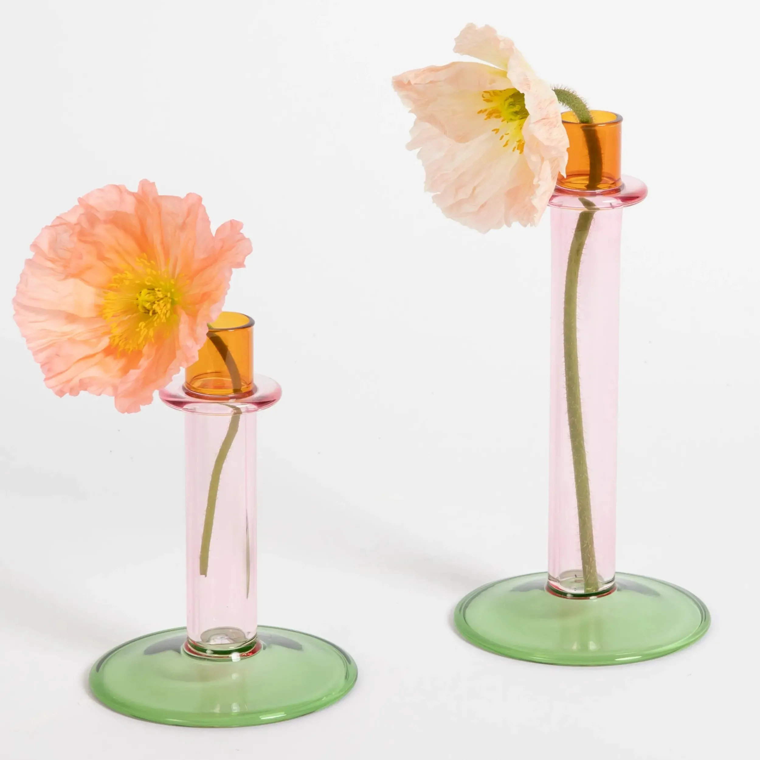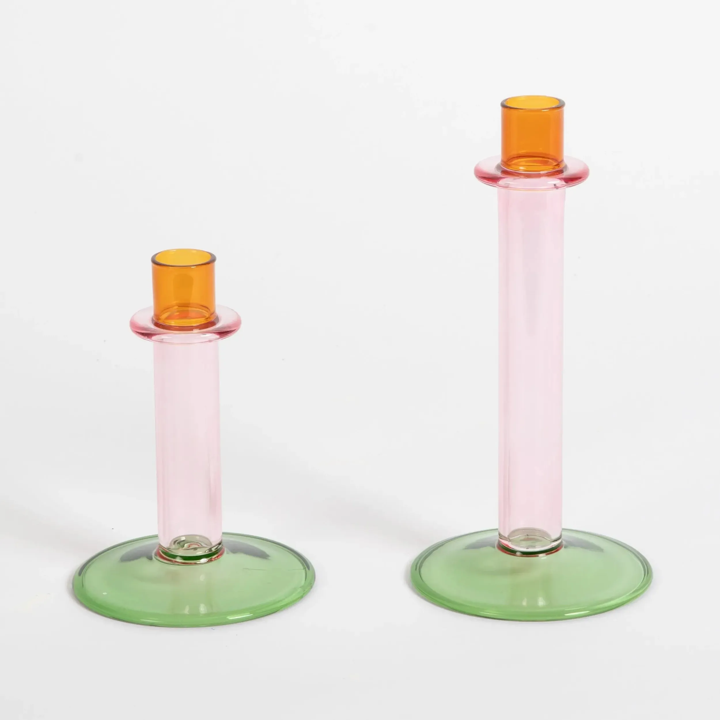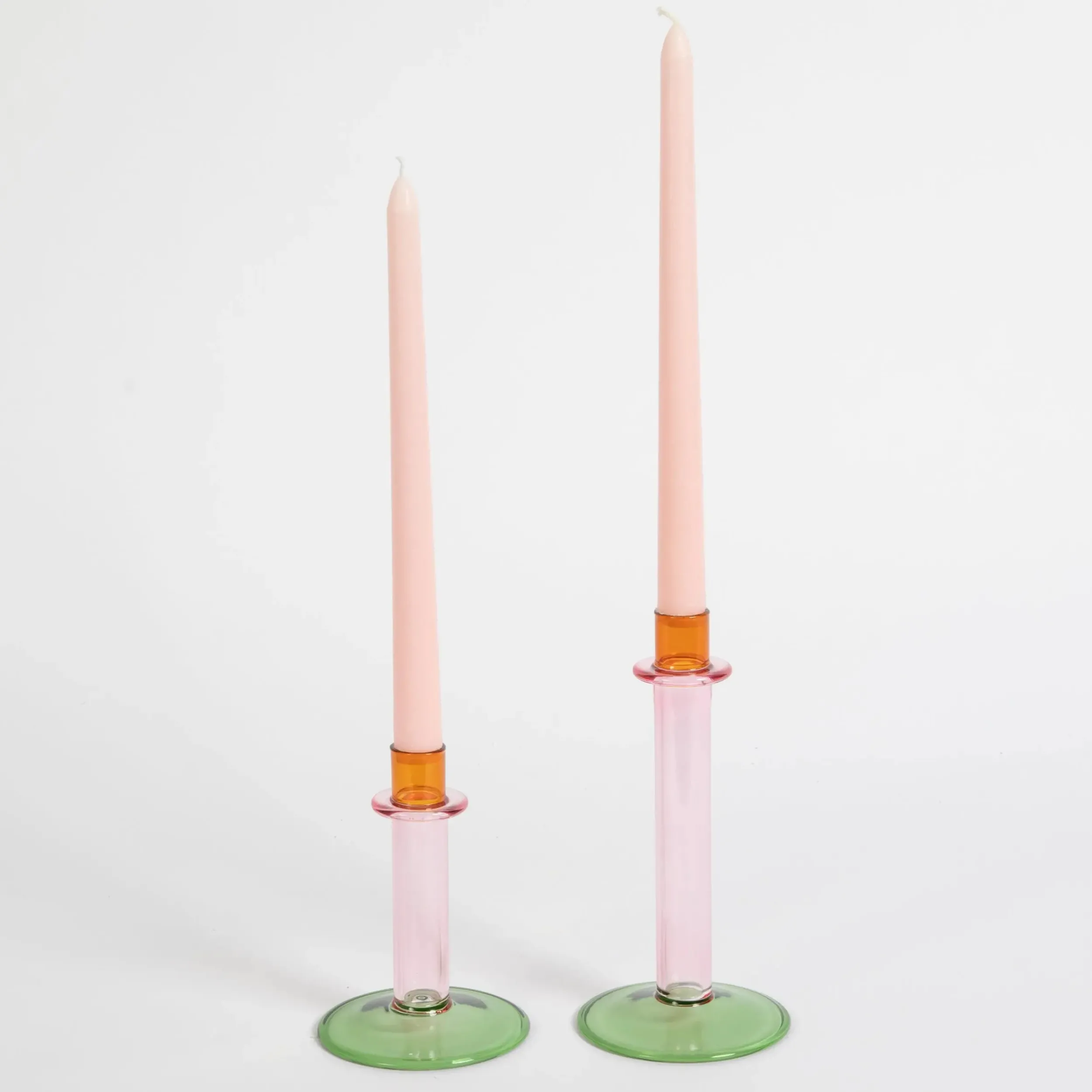 Towering turrets of tri-tone coloured amber, pink and green glass deliver spring style in this Candle Holder set designed to house two standard taper candle holders.