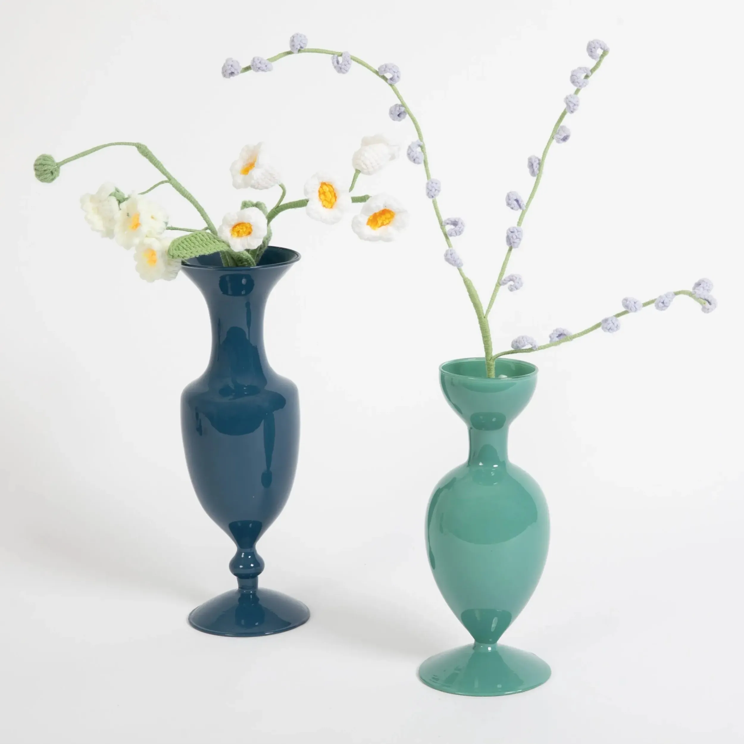 Glossy, opaque milk glass has been masterfully manipulated into a modern interpretation of a Greco-Roman urn shaped Glass Vase, finished in a royal shade of navy blue ready for the additions of flowers.