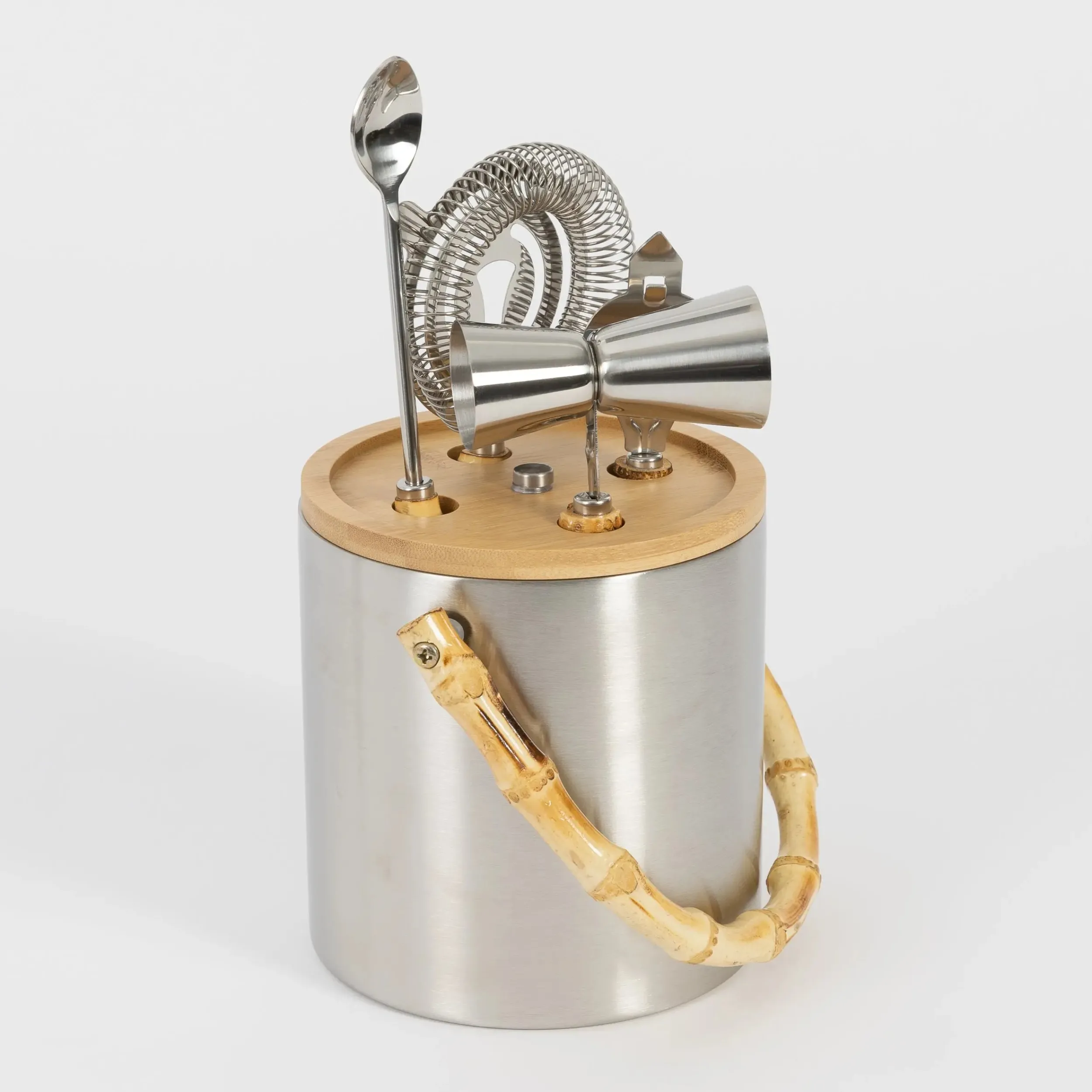 Shop all your Bar Tool essentials at the click of a button with this 5 piece metal and bamboo ice bucket set featuring long-stemmed mixing spoon, bottle opener, Hawthorne strainer and jigger.