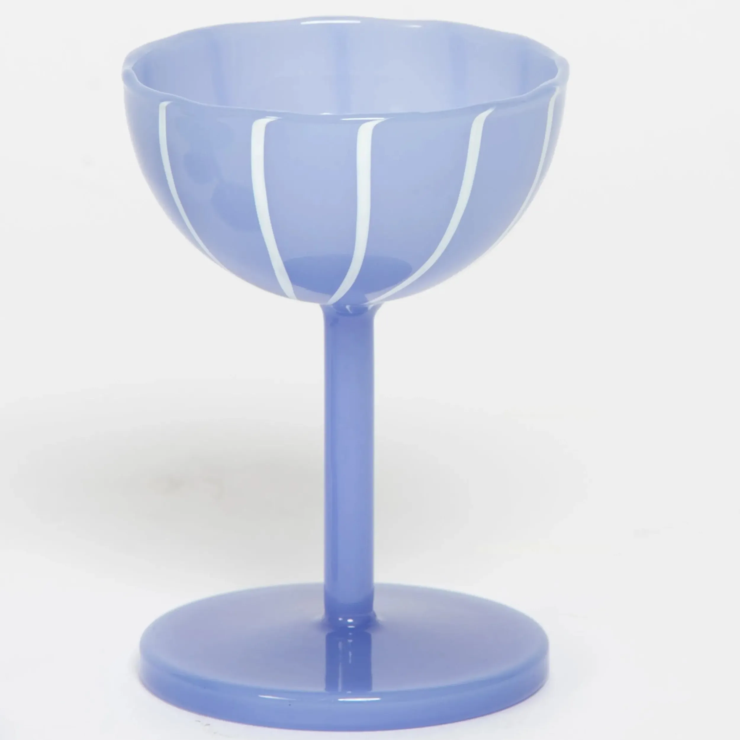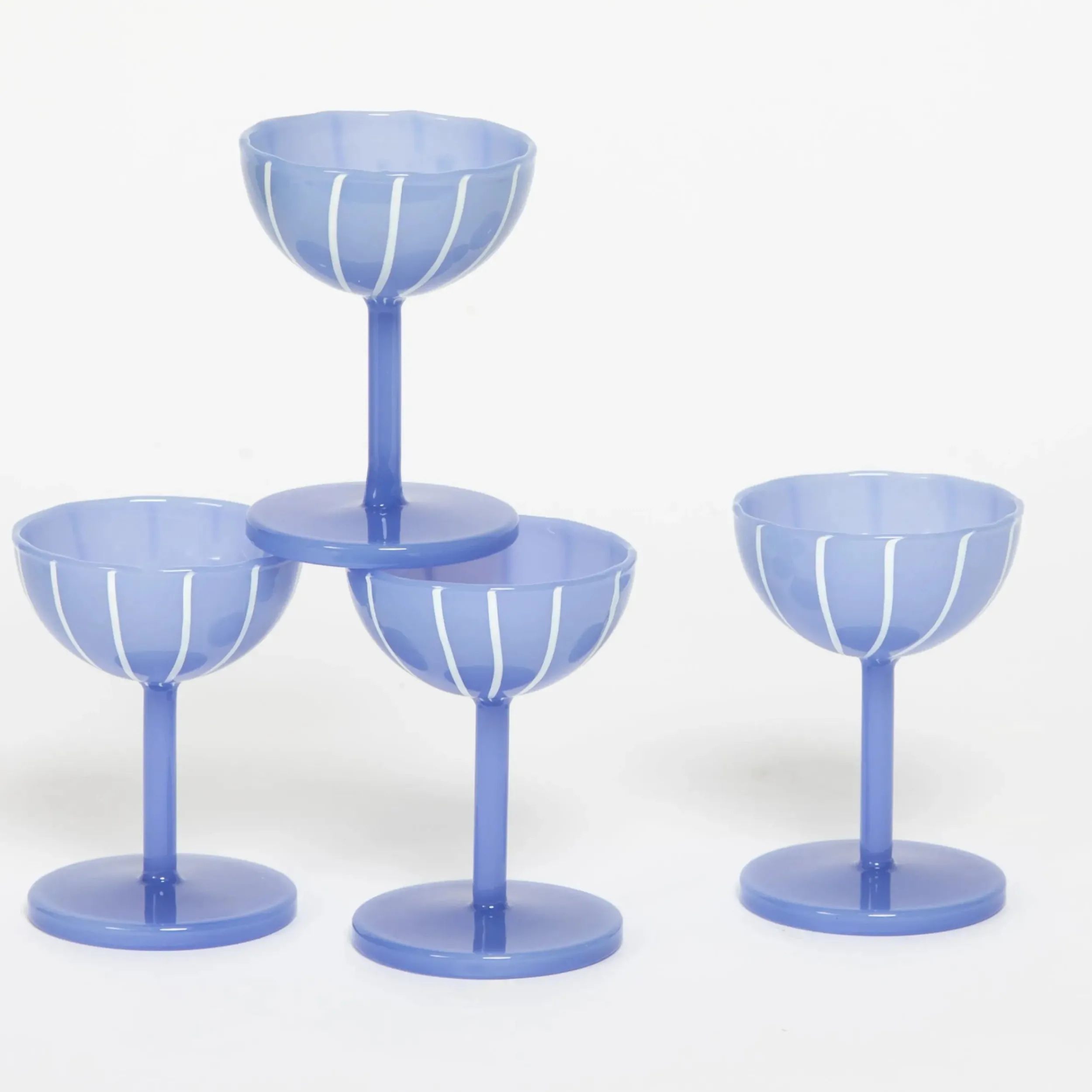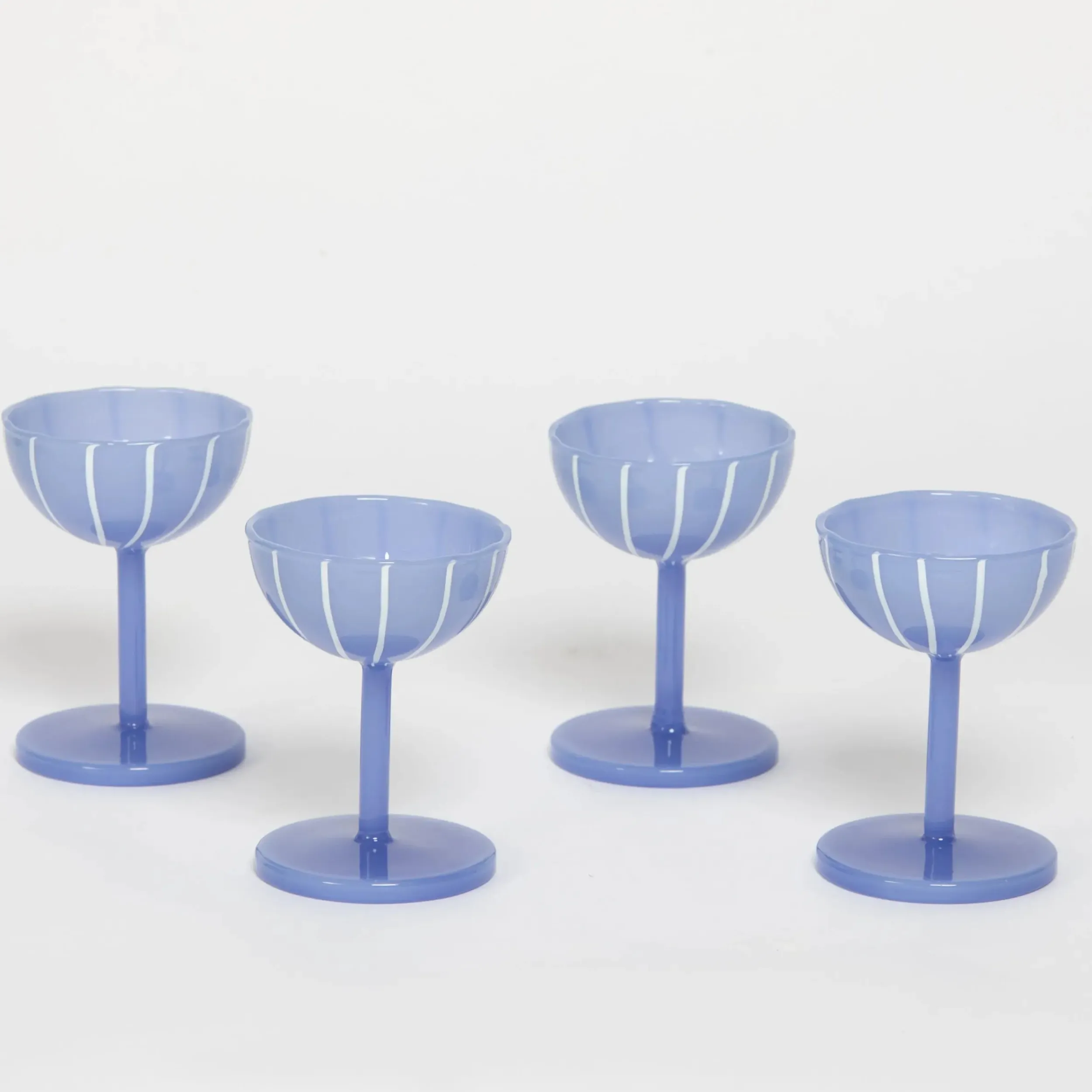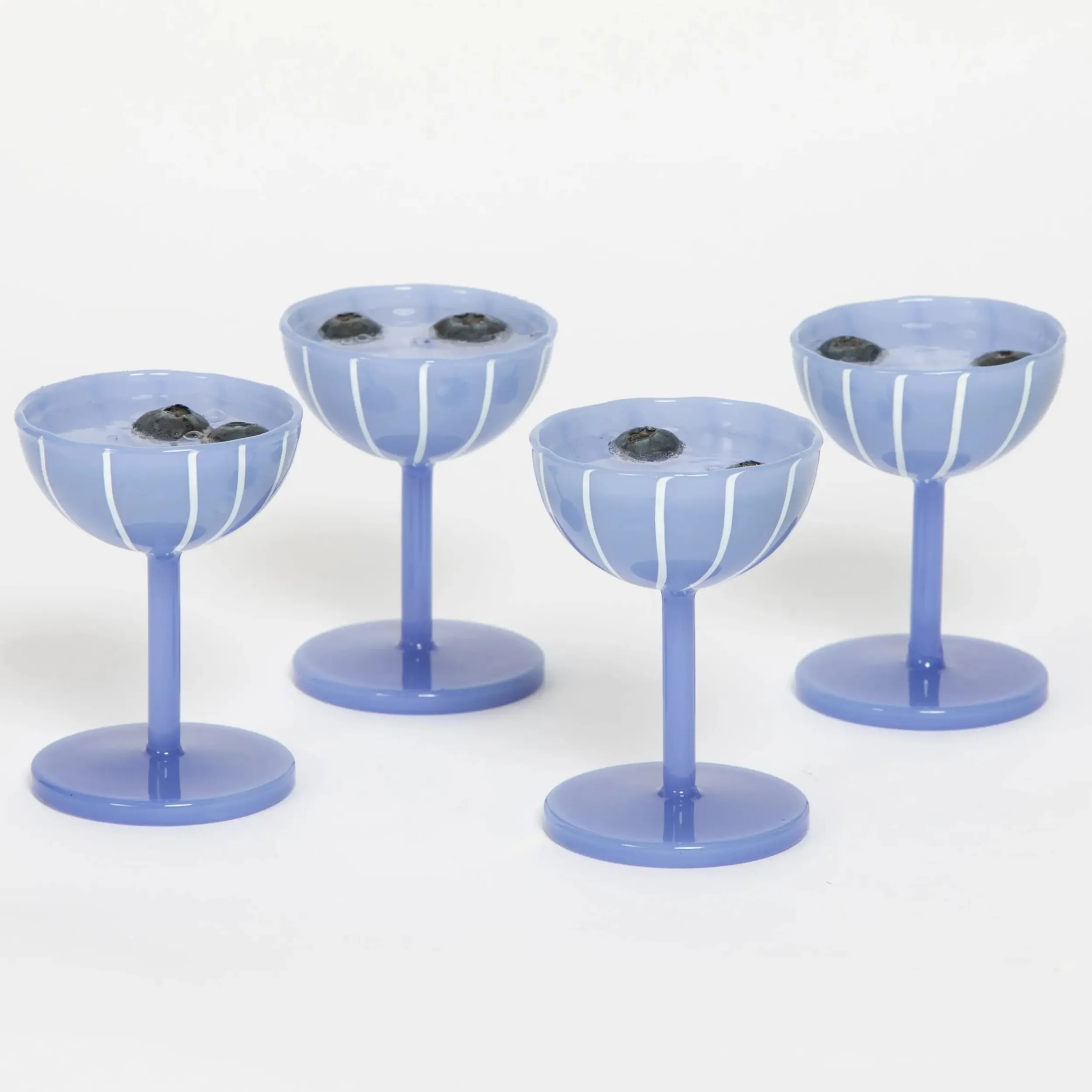 This cute take on a Shot Glass features four half-moon shaped glasses in a milky mid-blue with fine white line detail; the stemmed design adds a chic touch to your next shot (alcoholic or turmeric!)