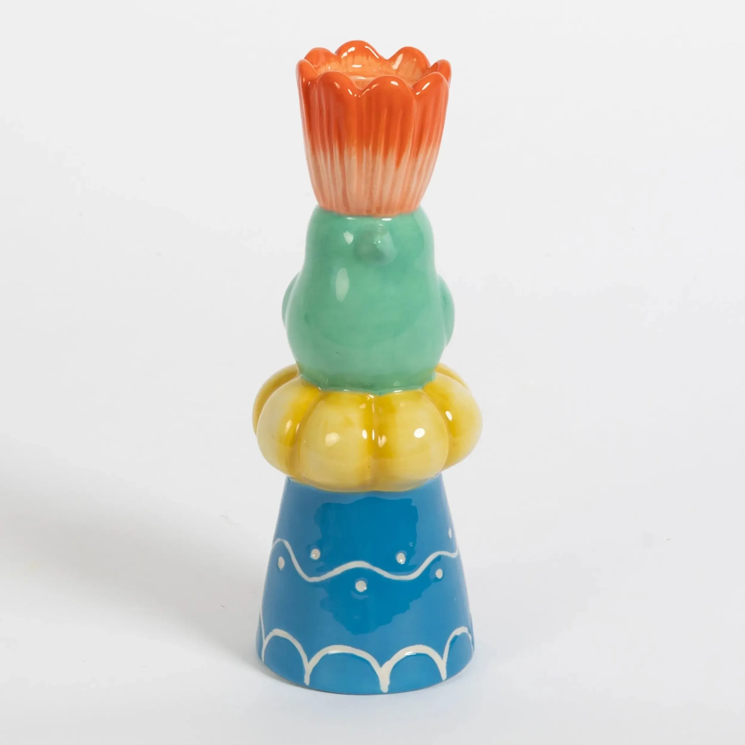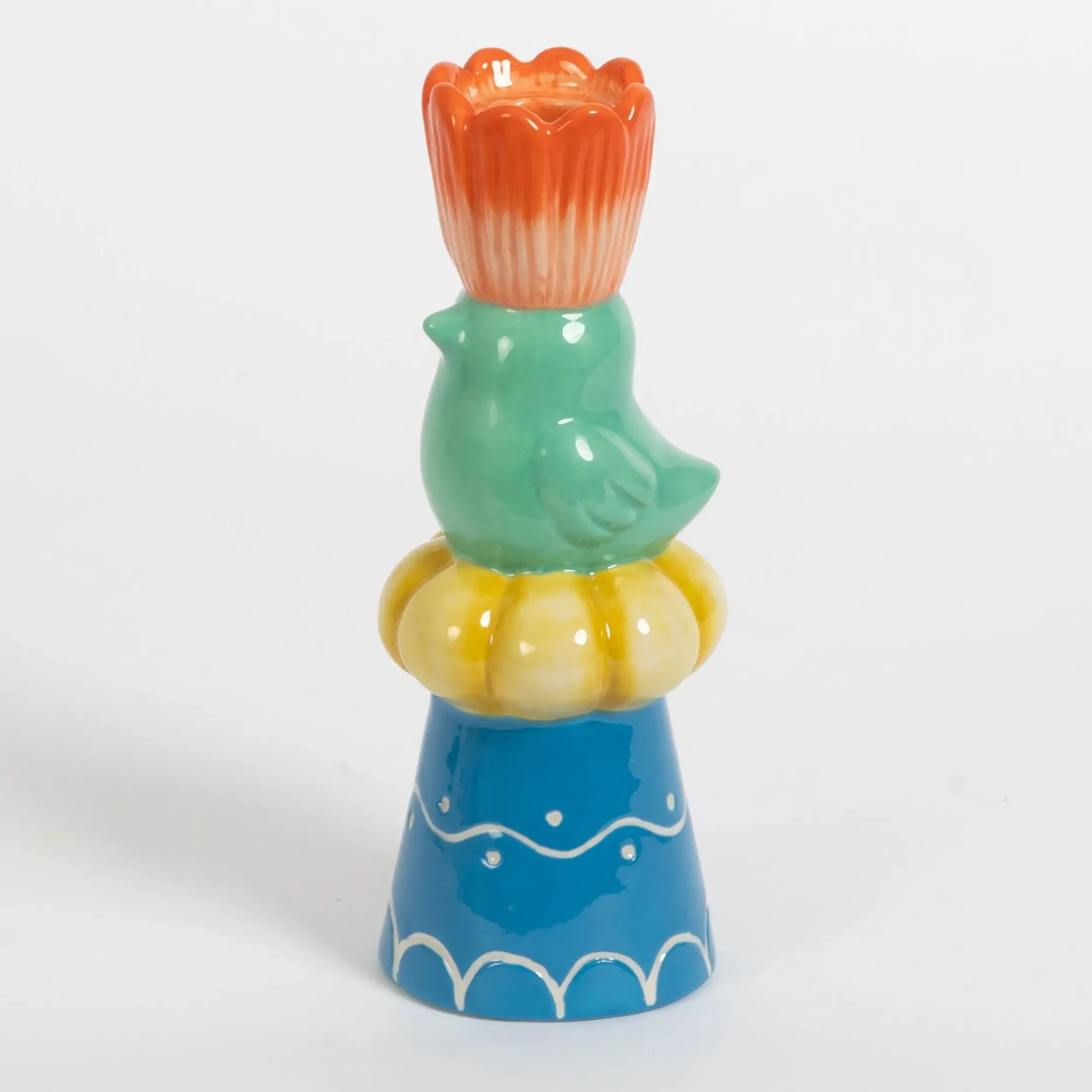 Charming coloured ceramic combines with sweet country motifs in this hen and flower-shaped unique taper candle holder in glazed shades of aqua, apricot, pale yellow and blue ceramic.