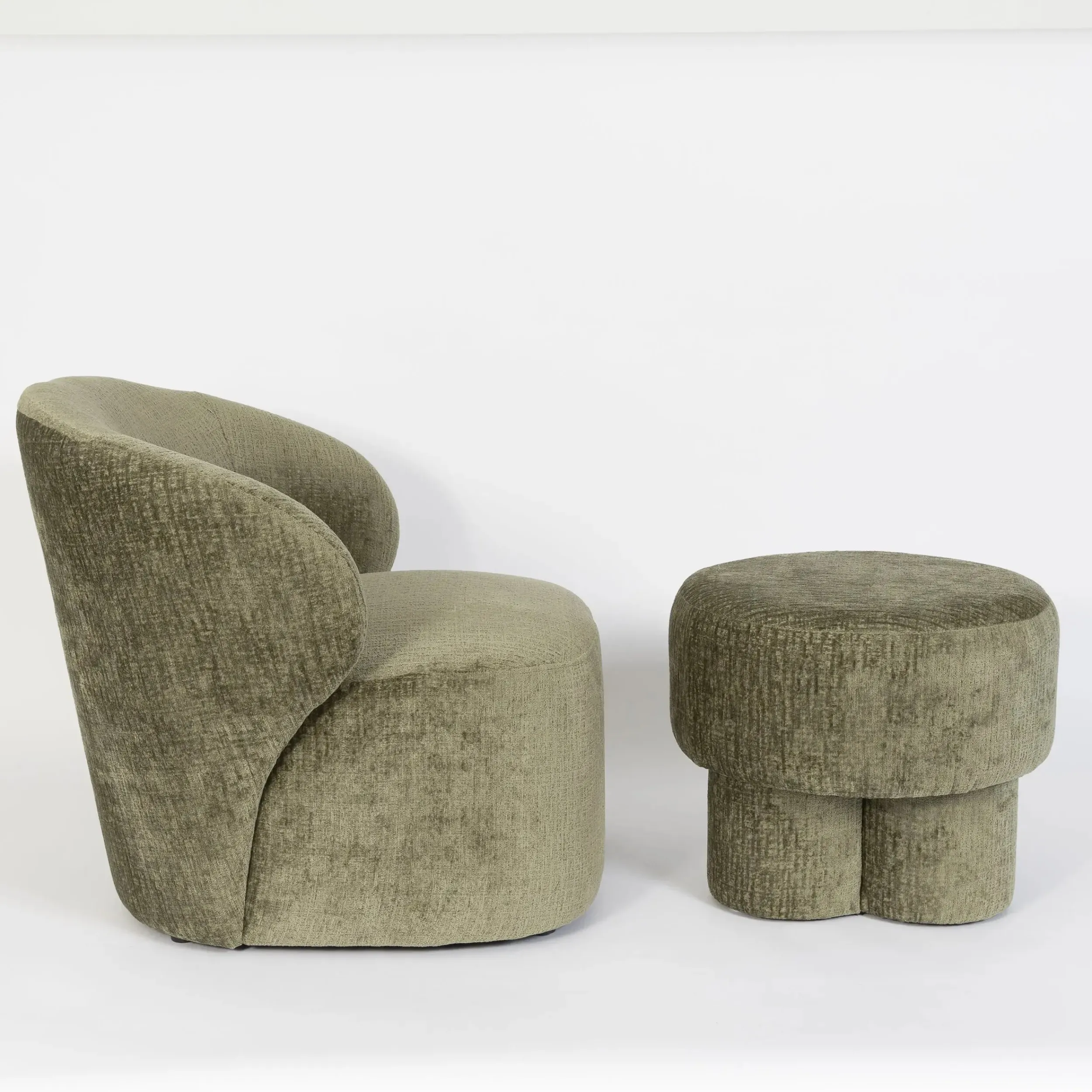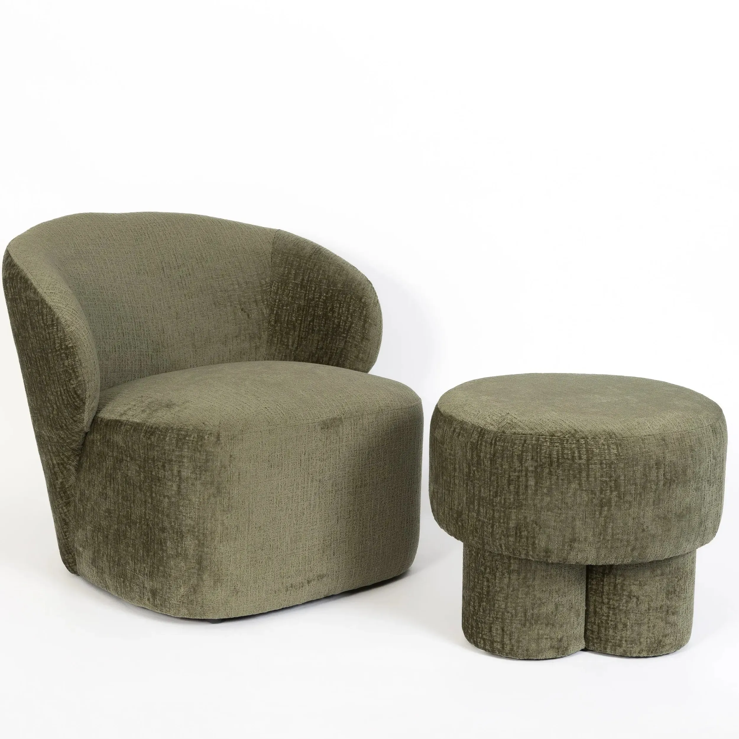 Add fun and function to your space with this playfully shaped round Chenille Ottoman balanced atop a chubby tri-column shaped central leg design. Versatile and multi-functional, this stool, ottoman or footrest can be used across many spaces to add seating or storage, while it’s olive green colourway disguises stains with ease.