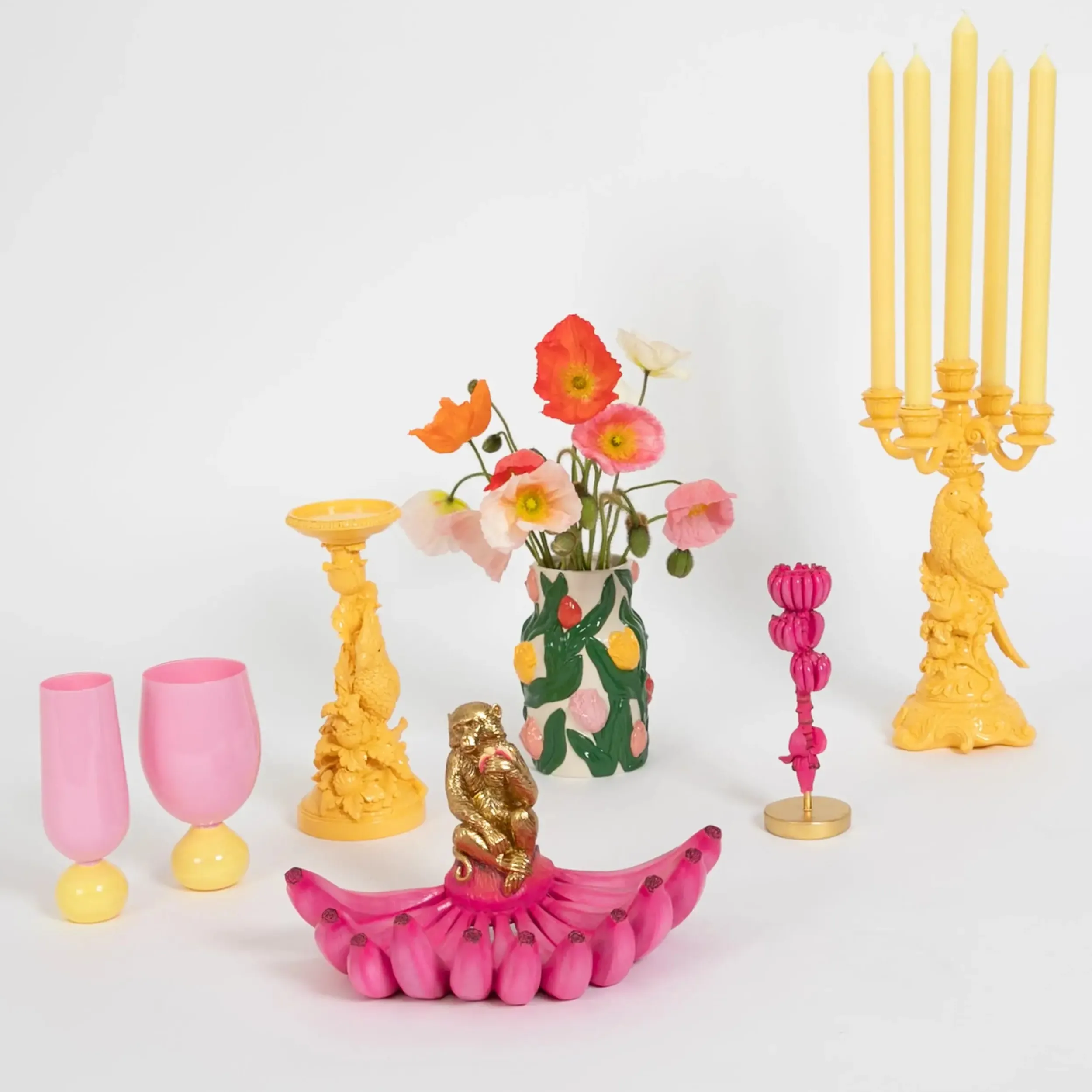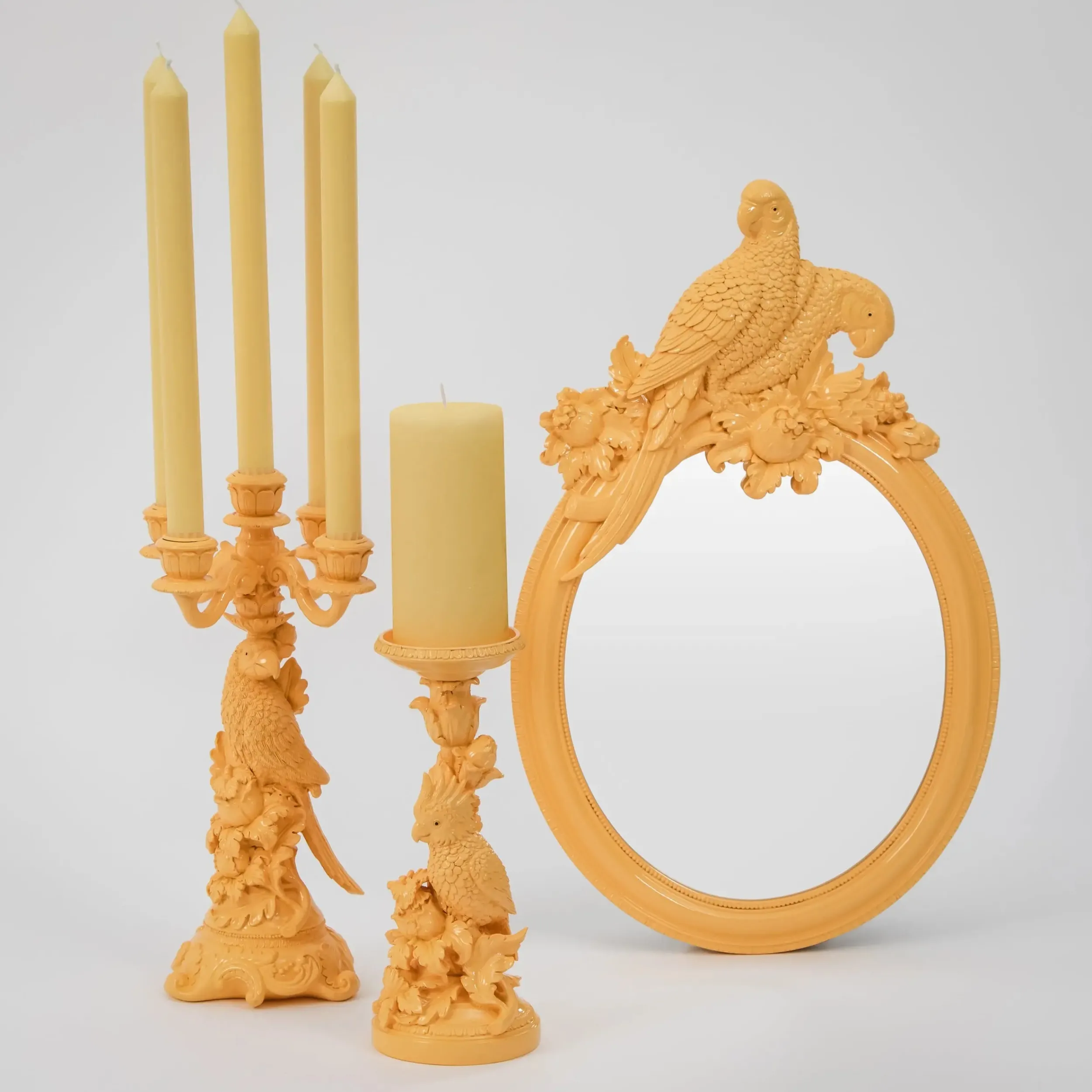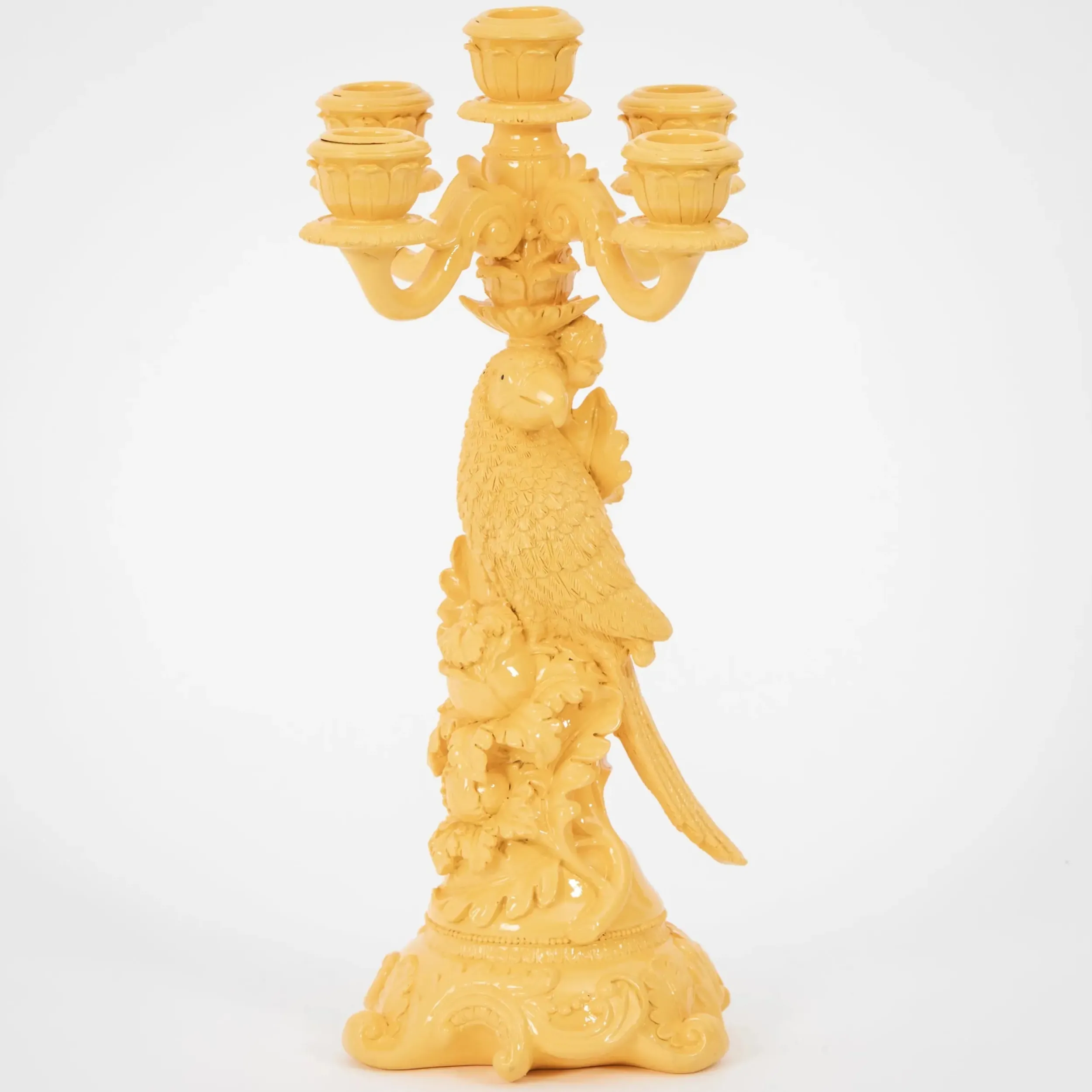 Take your candle accessories to showstopping heights with this ornately moulded Resin Candelabra in vibrant canary yellow featuring regency inspired details, moulded florals and cheeky cockatoo.