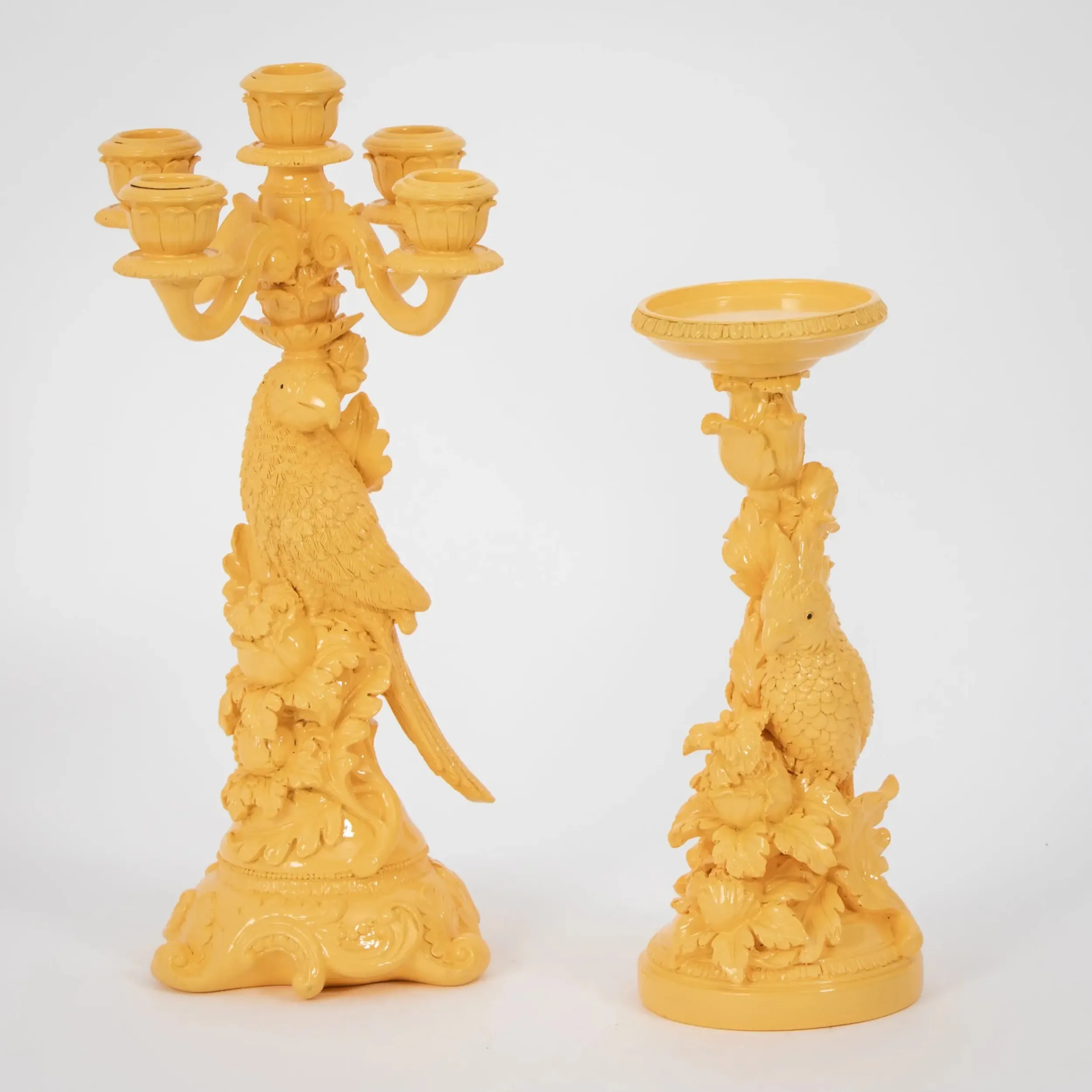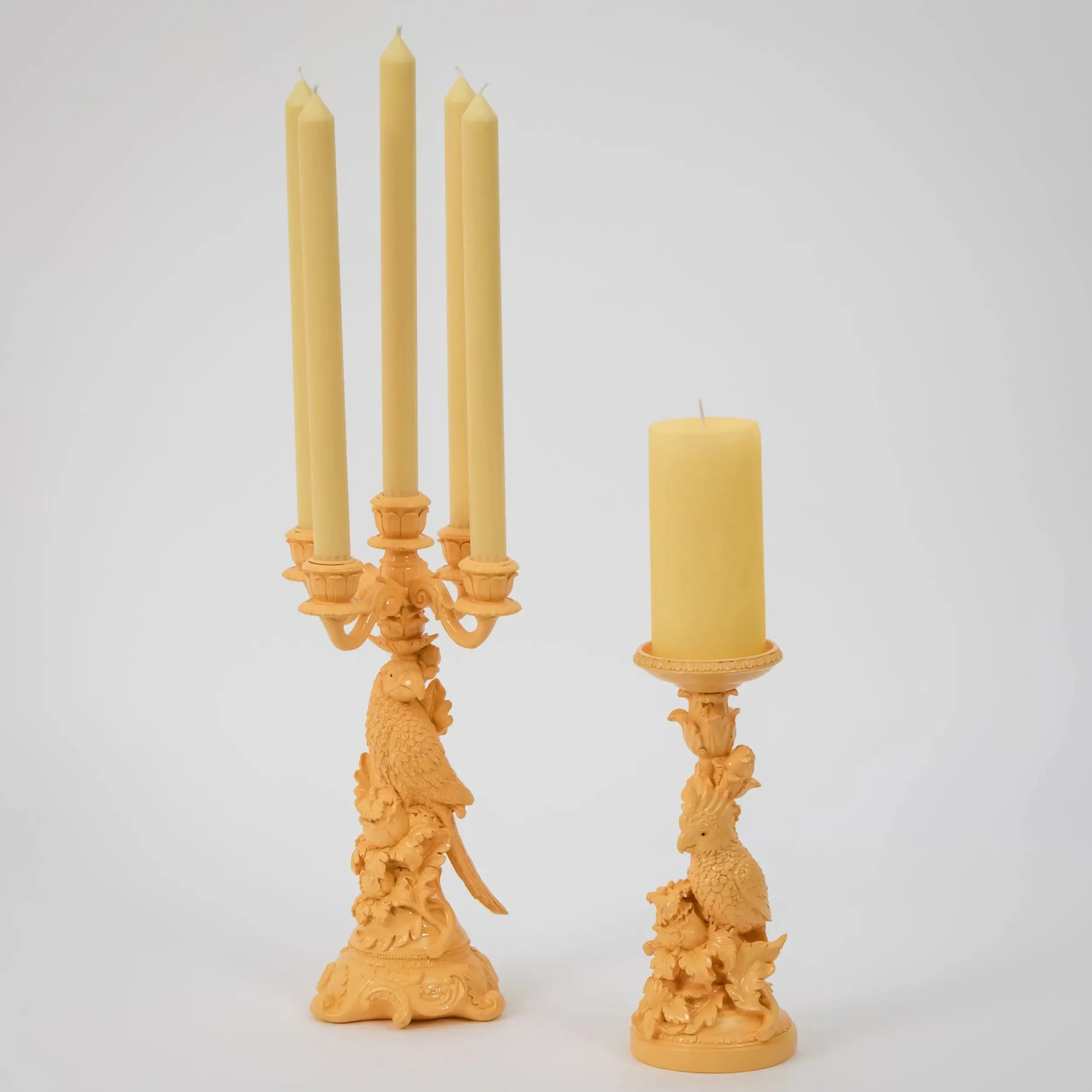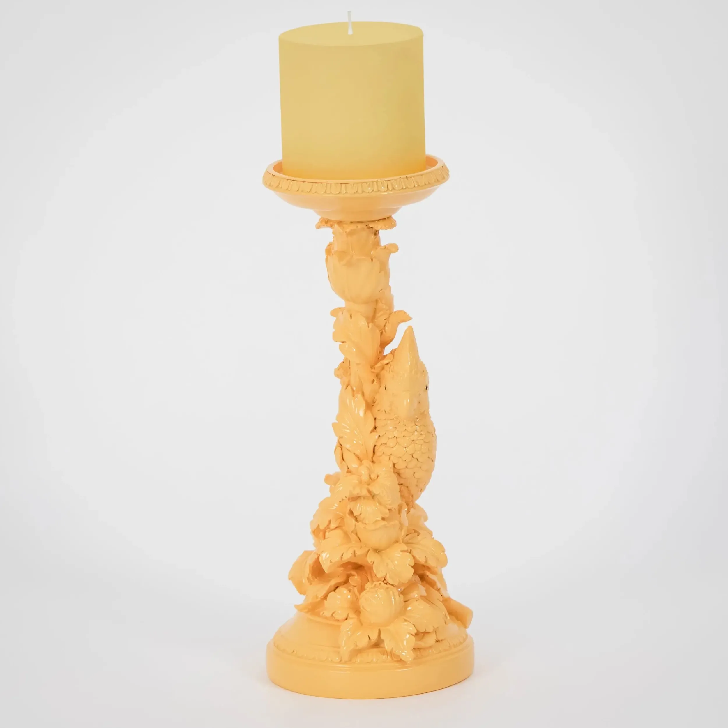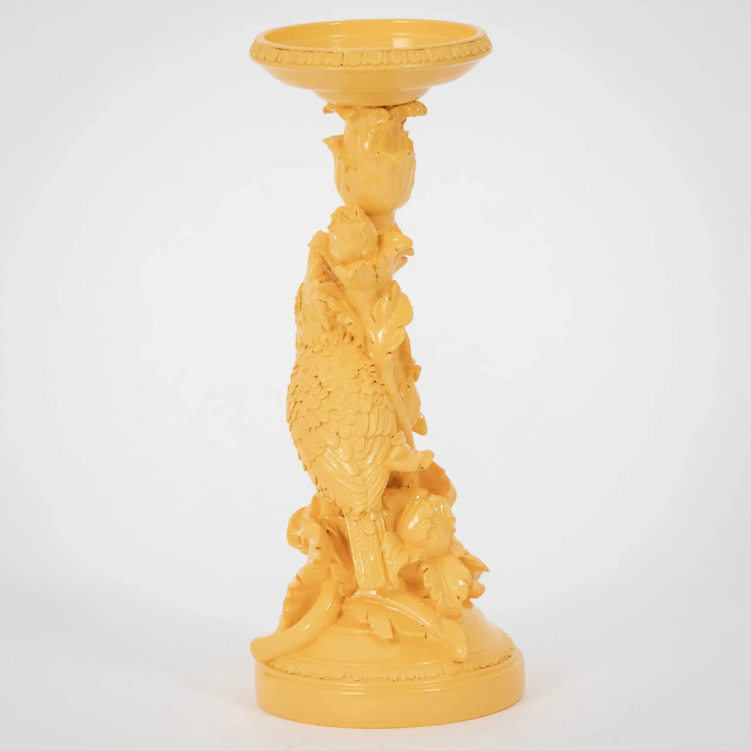 Celebrate the cheerful cockatoo with this ornate Resin Candle Holder in vibrant canary yellow with circular base and intricate florals. Style as is or use to display candles and trinkets.