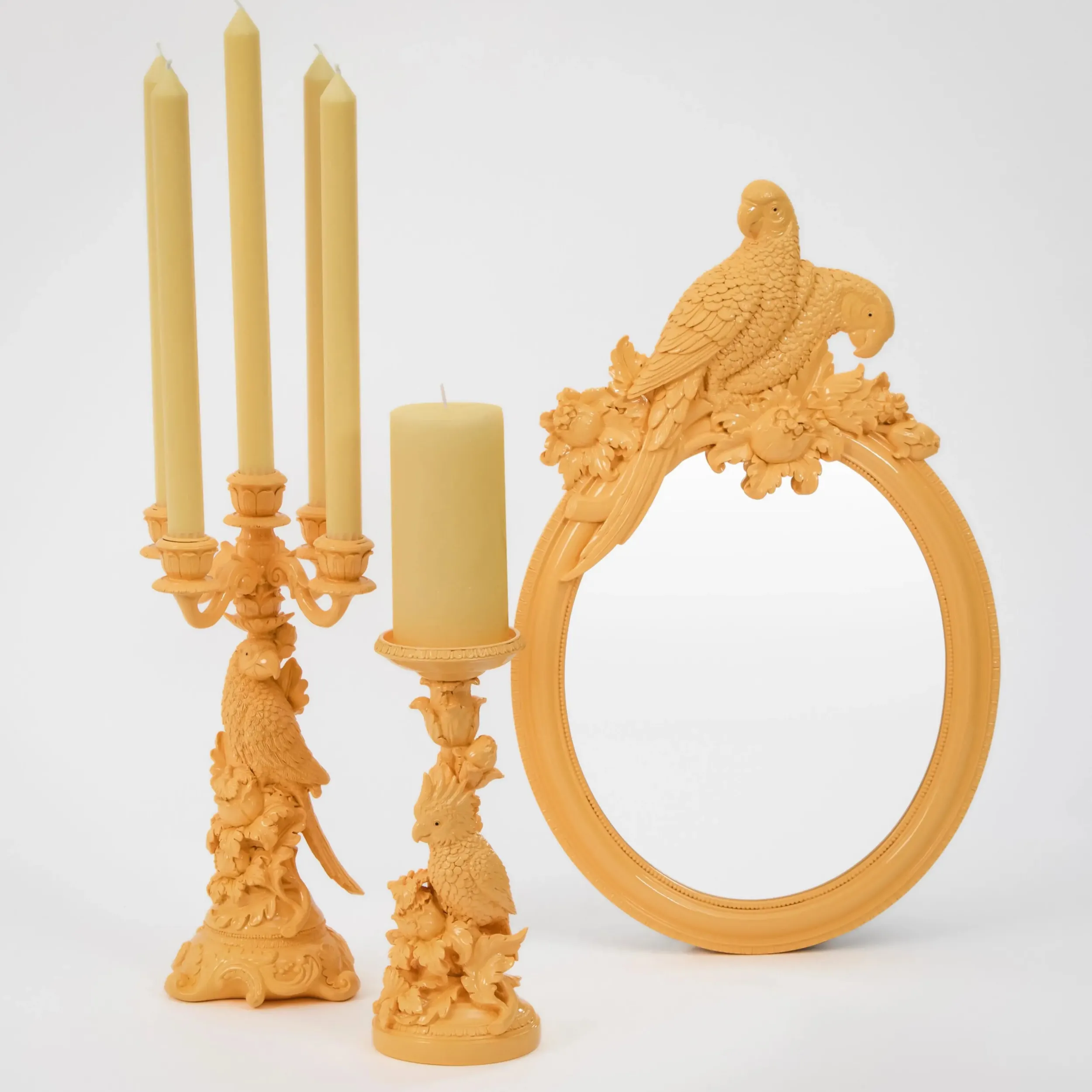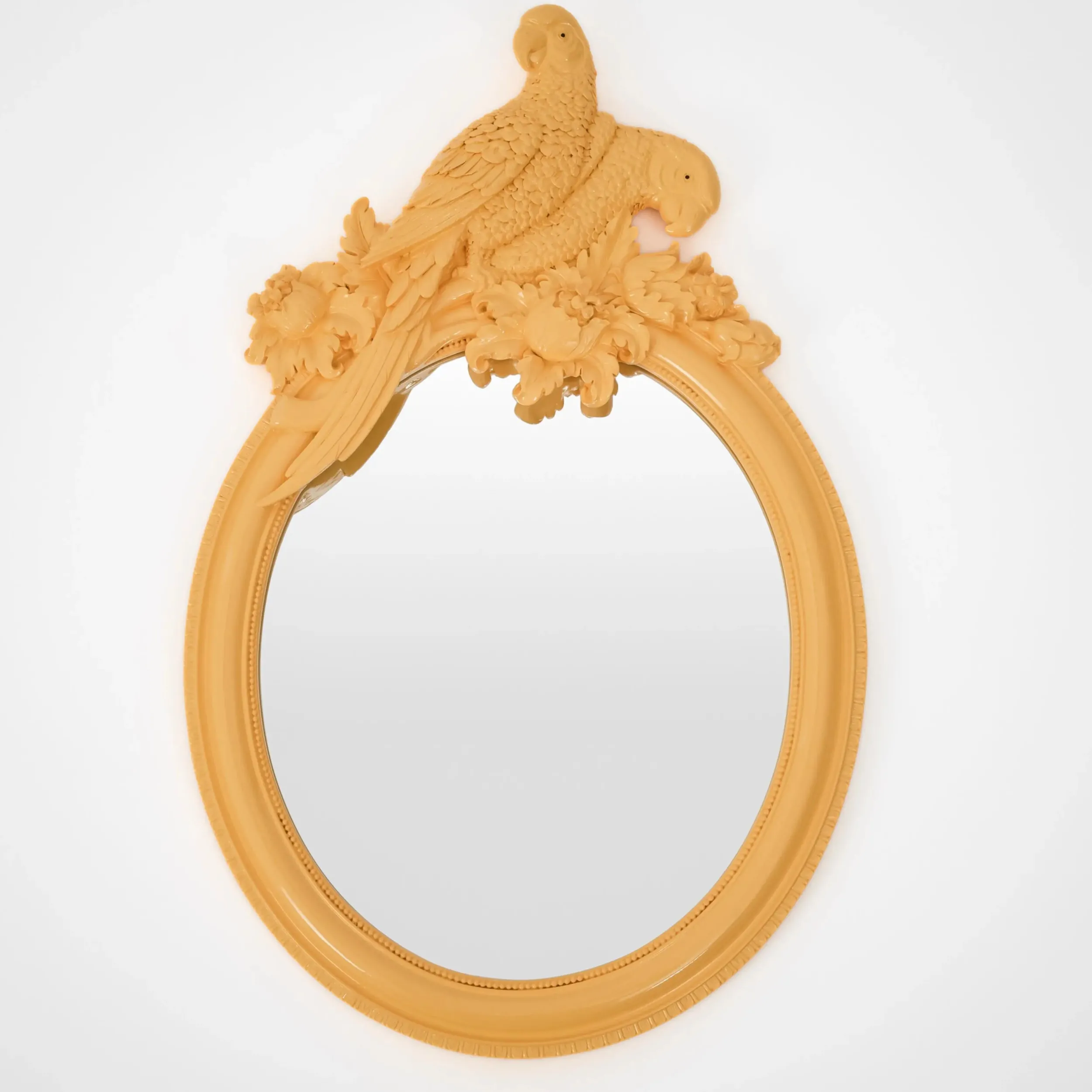 Birds of a feather stick together in this ornate, oval-shaped Resin Wall Mirror featuring a masterfully moulded canary yellow resin frame with two perched parrots and intricate botanical detail.