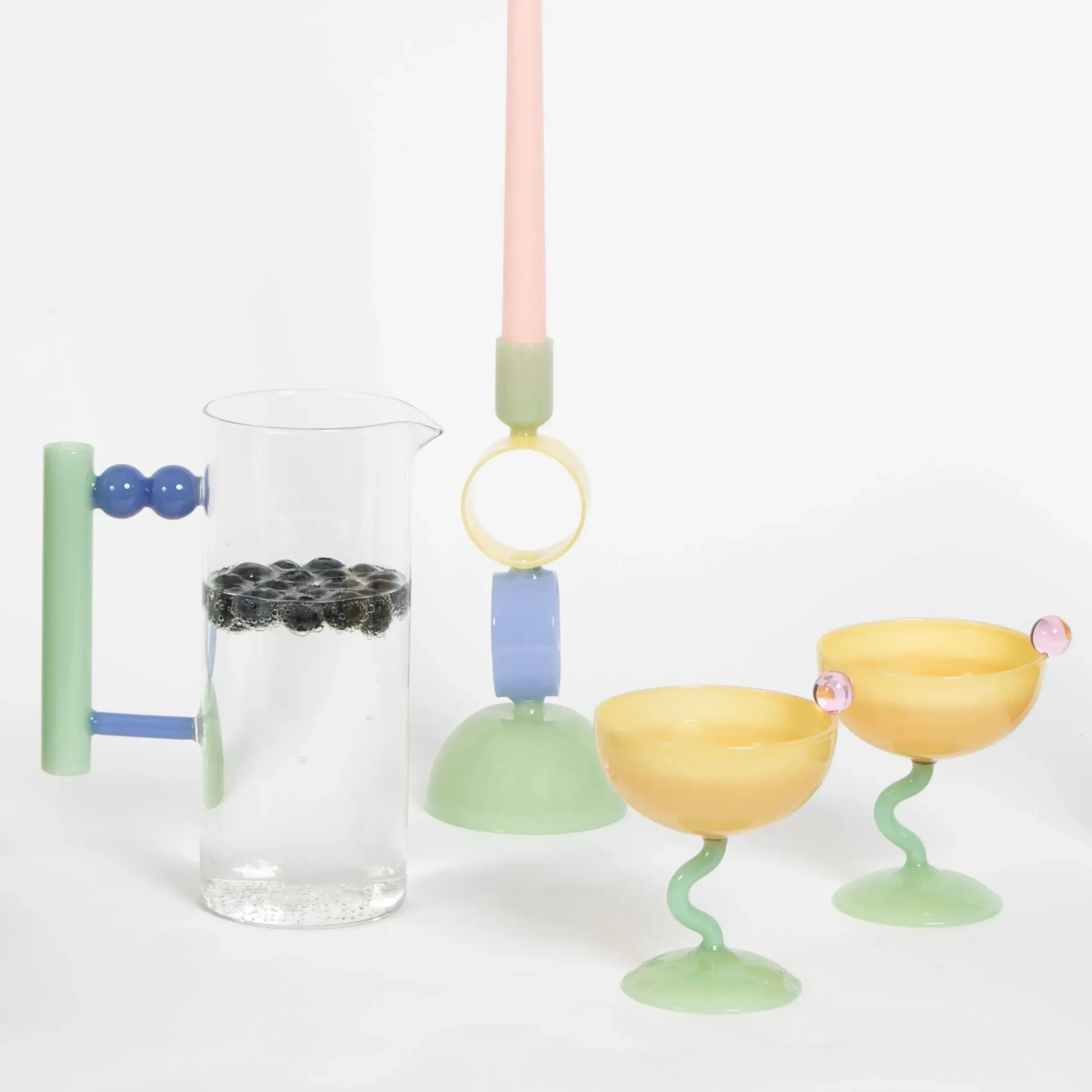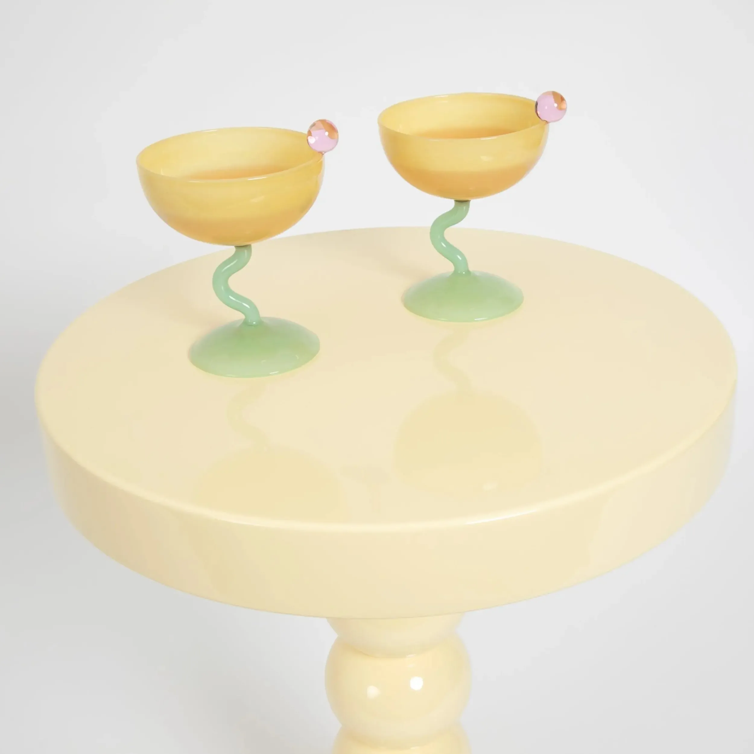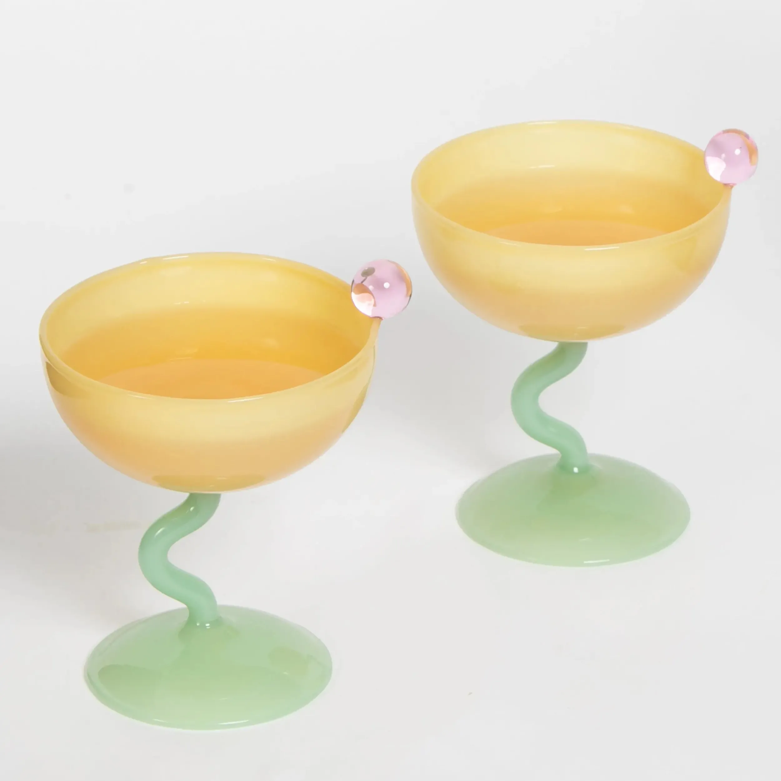 Swerve into soiree season with this Cocktail Glass set in dreamy milk glass. A swirled green glass stem pops against the half-moon shaped yellow glass coupe adorned with pink blown glass sphere.