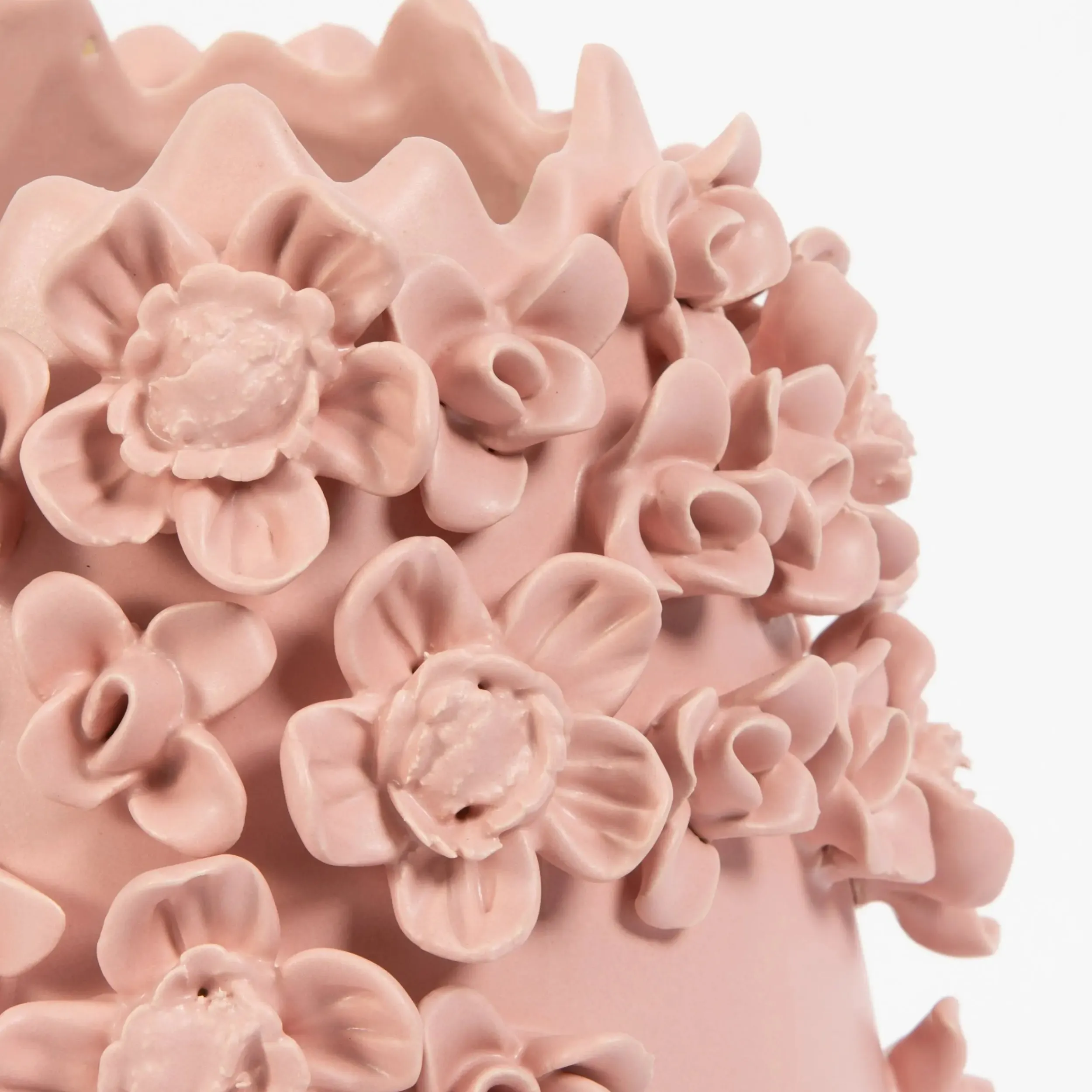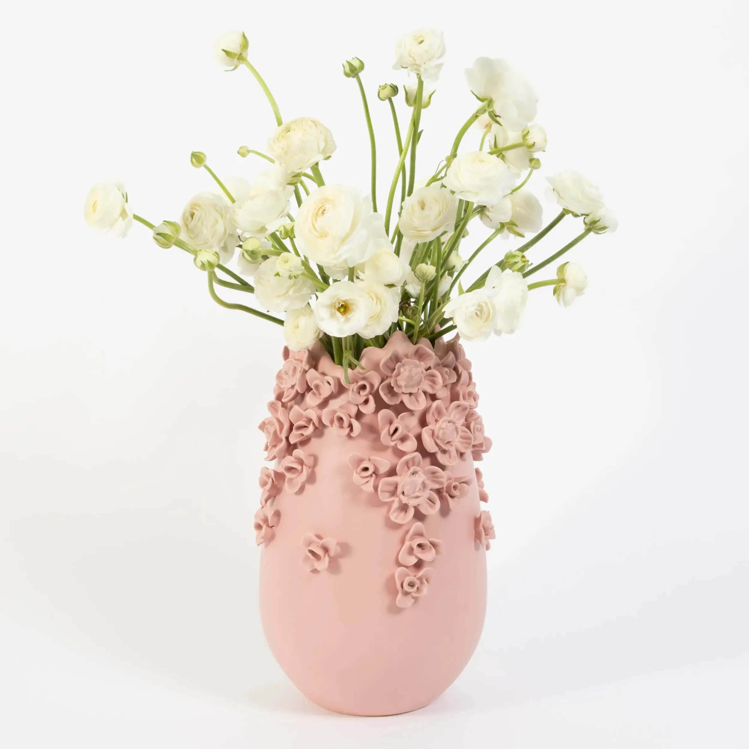 Strands of cascading ceramic flowers adorn this tall, glazed Ceramic Vase in feminine blush pink. A striking piece to create your own manicured garden aesthetic.