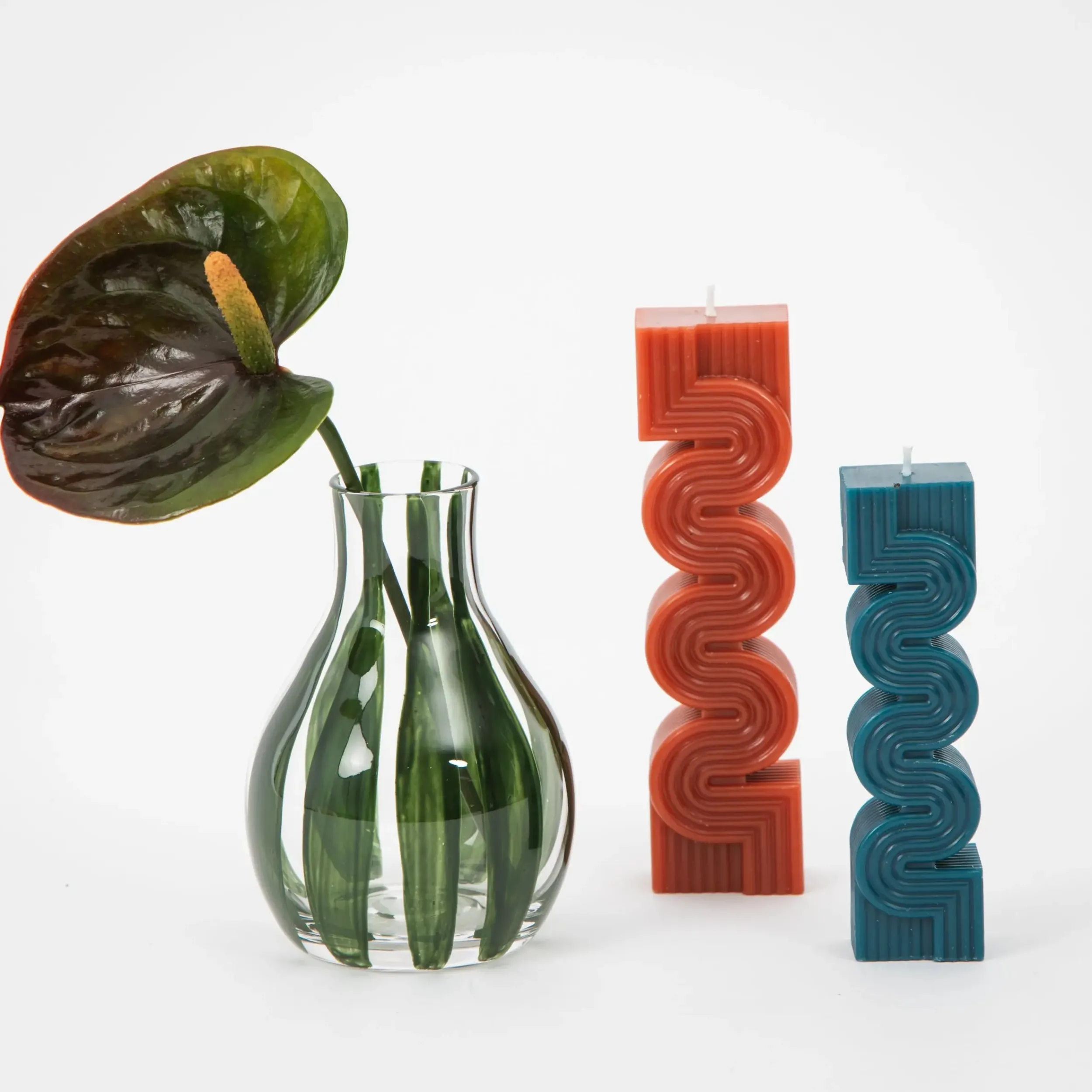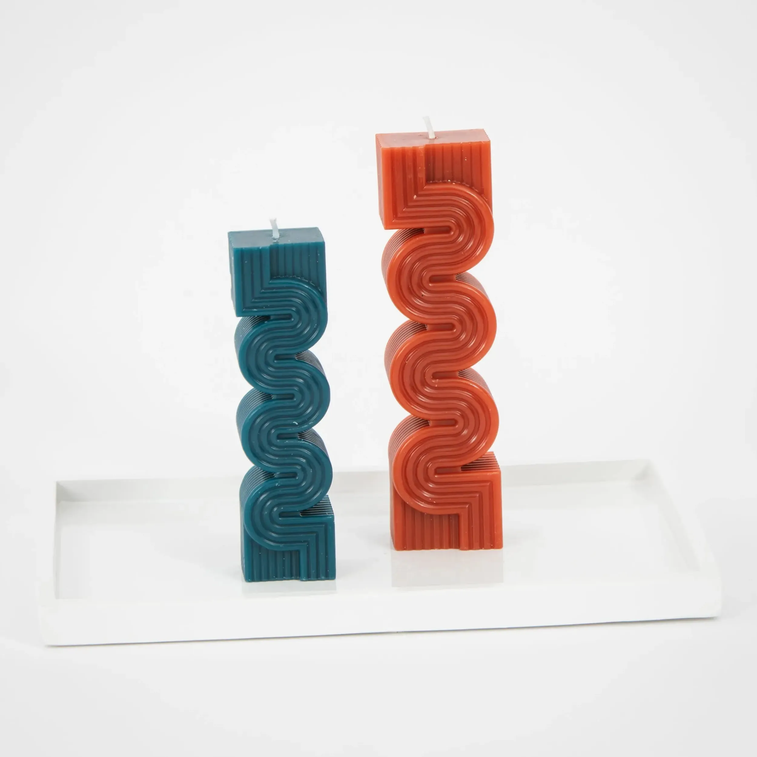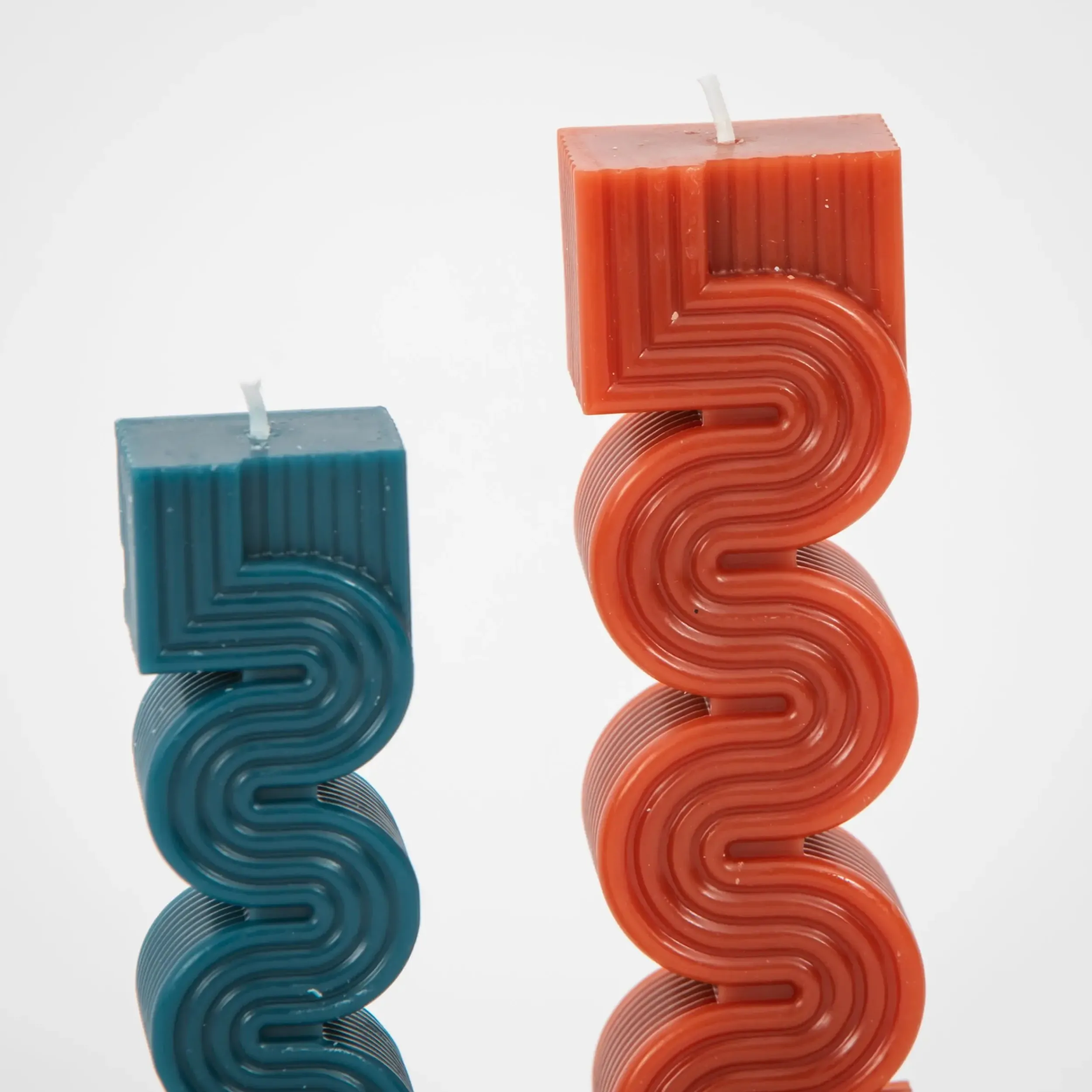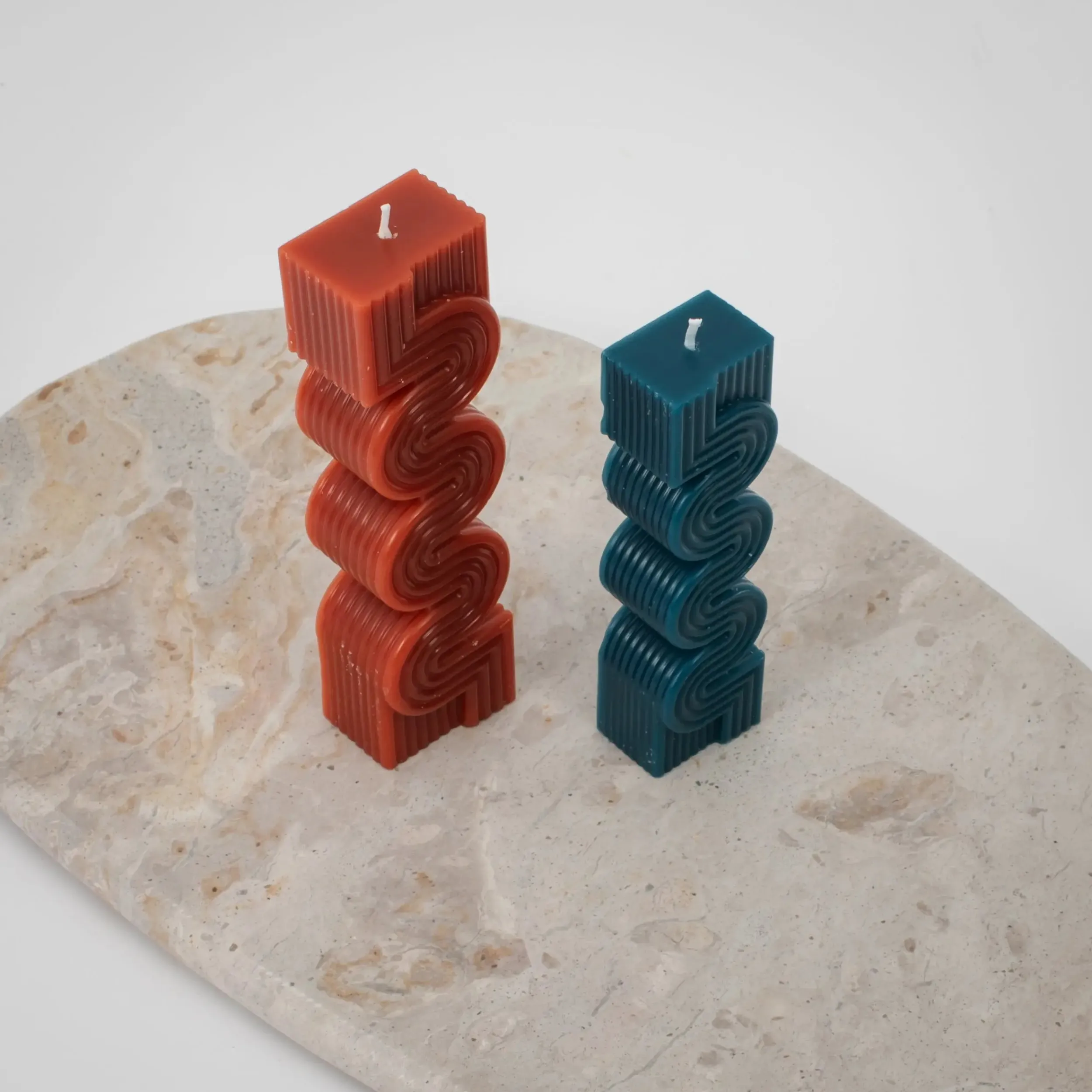 Curved and straight lines collide in this duo of geometrically inspired contemporary Pillar Candle set in complementary soy wax shades of brick and teal blue; fragrance free for sensitive noses.