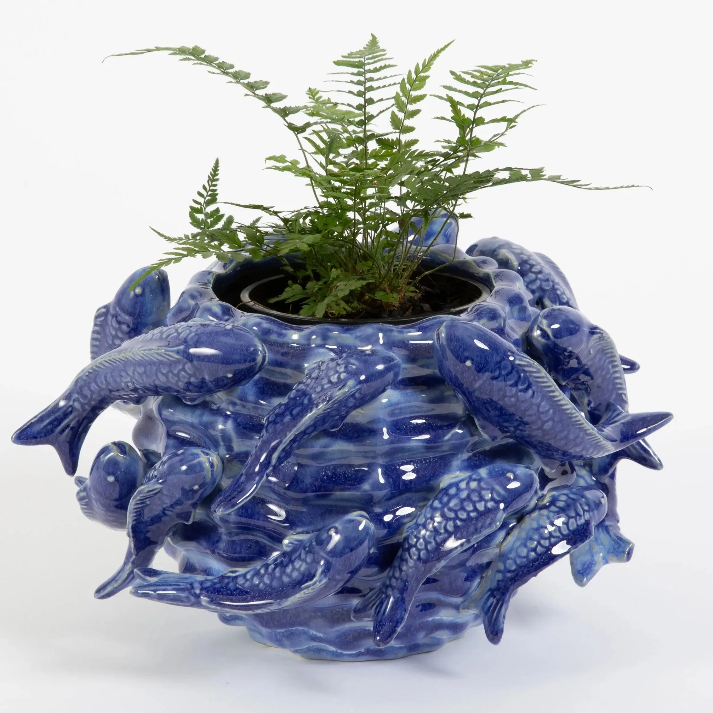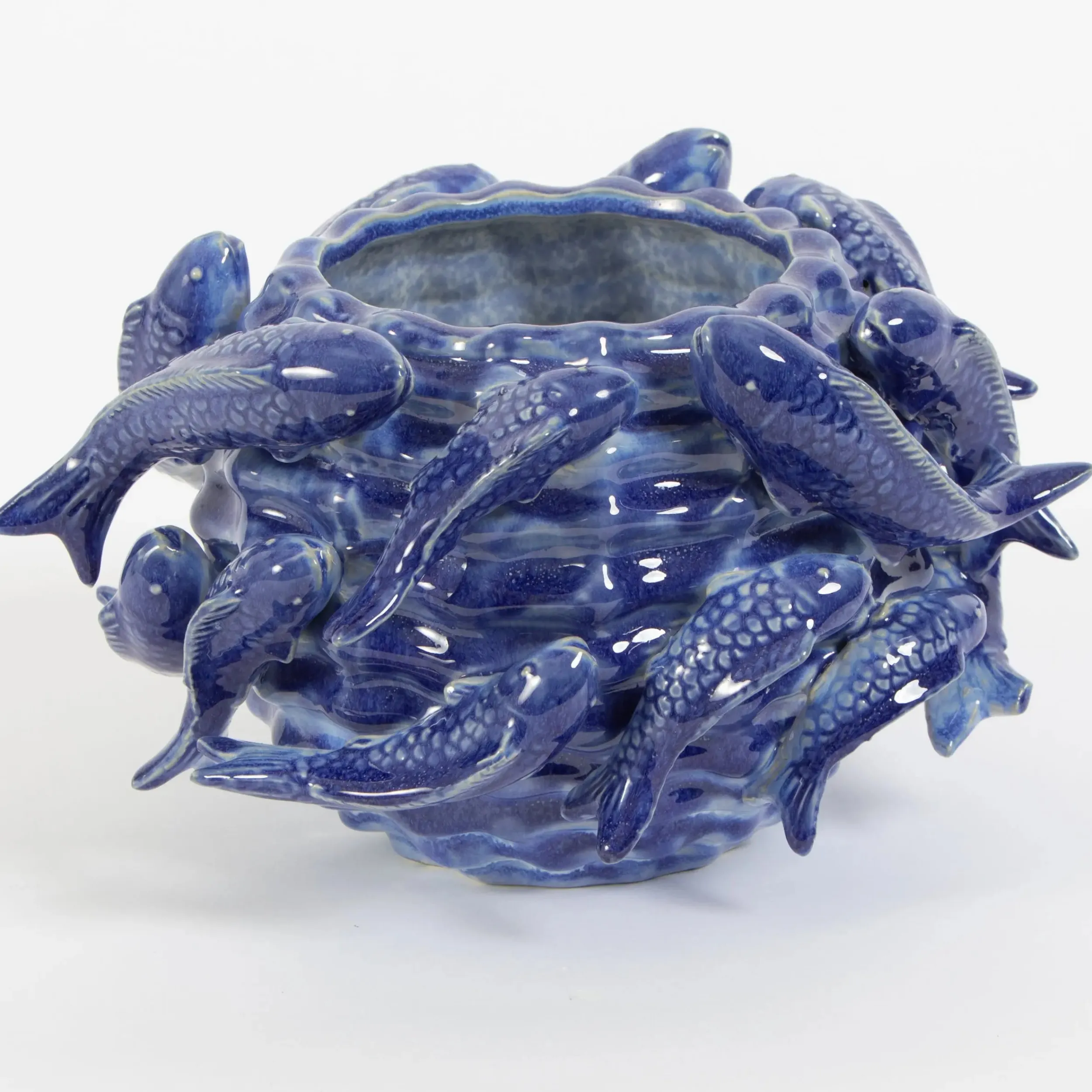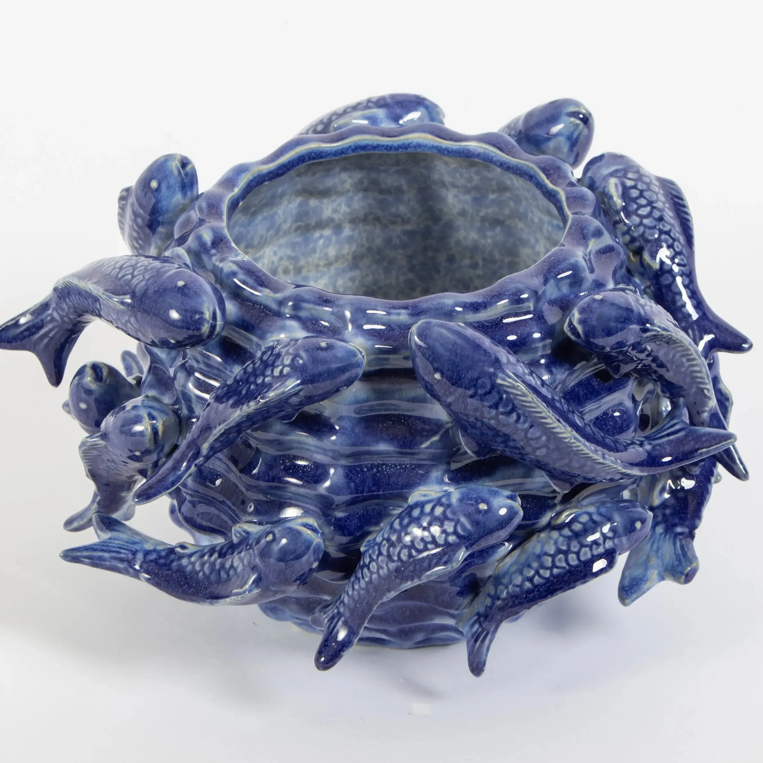 Enhance the Zen-like state of your home sanctuary with this mythical Ceramic Vase celebrating the serene nature of Japanese Koi fish in cool shades of blue sculptural, glazed ceramic.