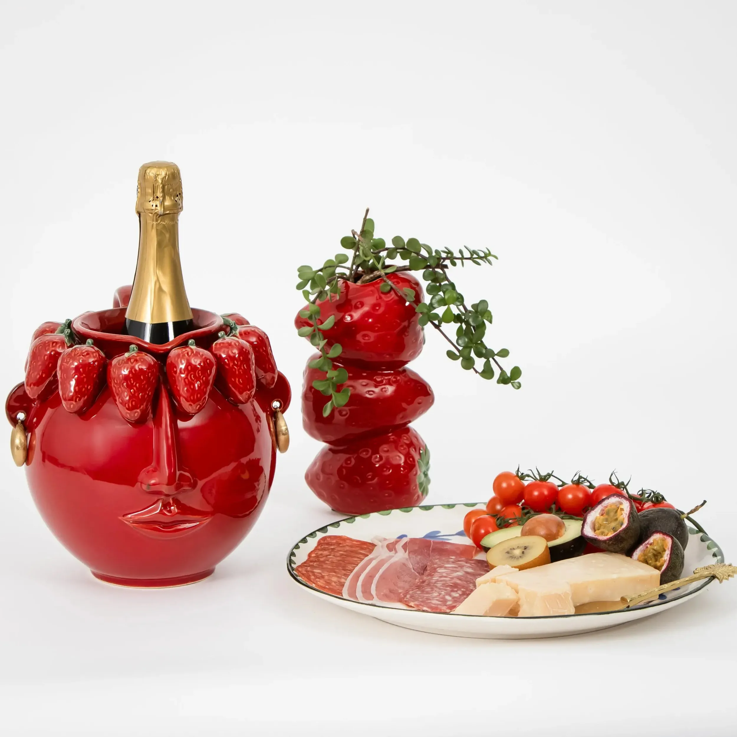 Spice up pitcher perfect summer parties with this red hot Ceramic Pitcher and Jug in deep crimson ceramic adorned with plump strawberry border and animated face design for coastal Euro summer vibes.